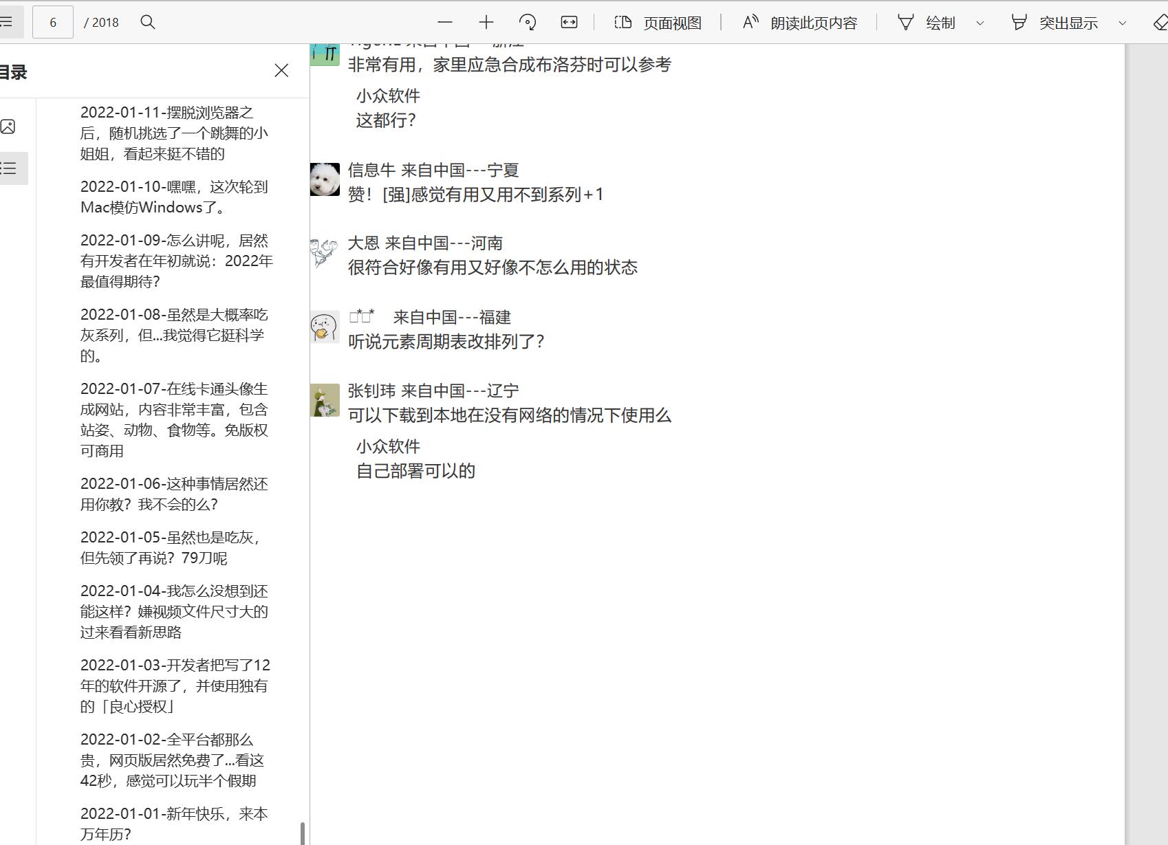 顺便把所有文章导出合成一个pdf文件(包含留言),左侧是文章标题书签,共272MB,看起来方便多了。