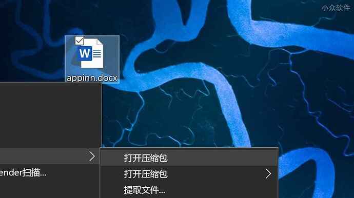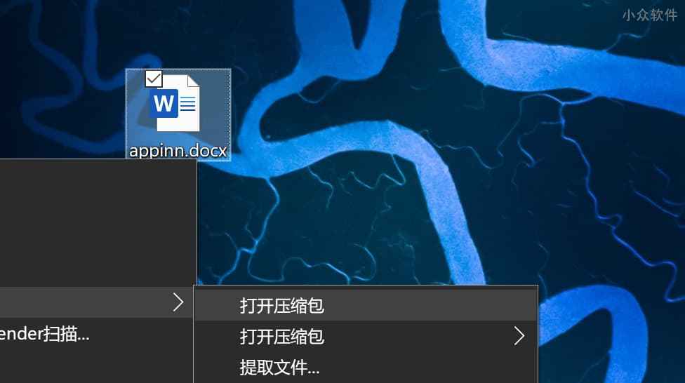 下面以 7zip 为例,右键 .docx 文件,选择 7zip > 打开压缩包: