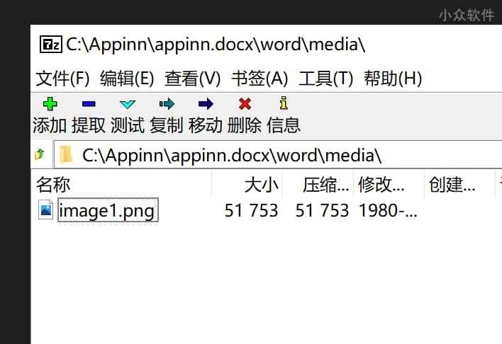 在青小蛙将这个问题抛给小众软件微博之后,@sva__(@半生瓜大叔、@e_bm)同学推荐了解压缩的方式:「docx就是个压缩包 直接压缩包打开,word/media 下」。