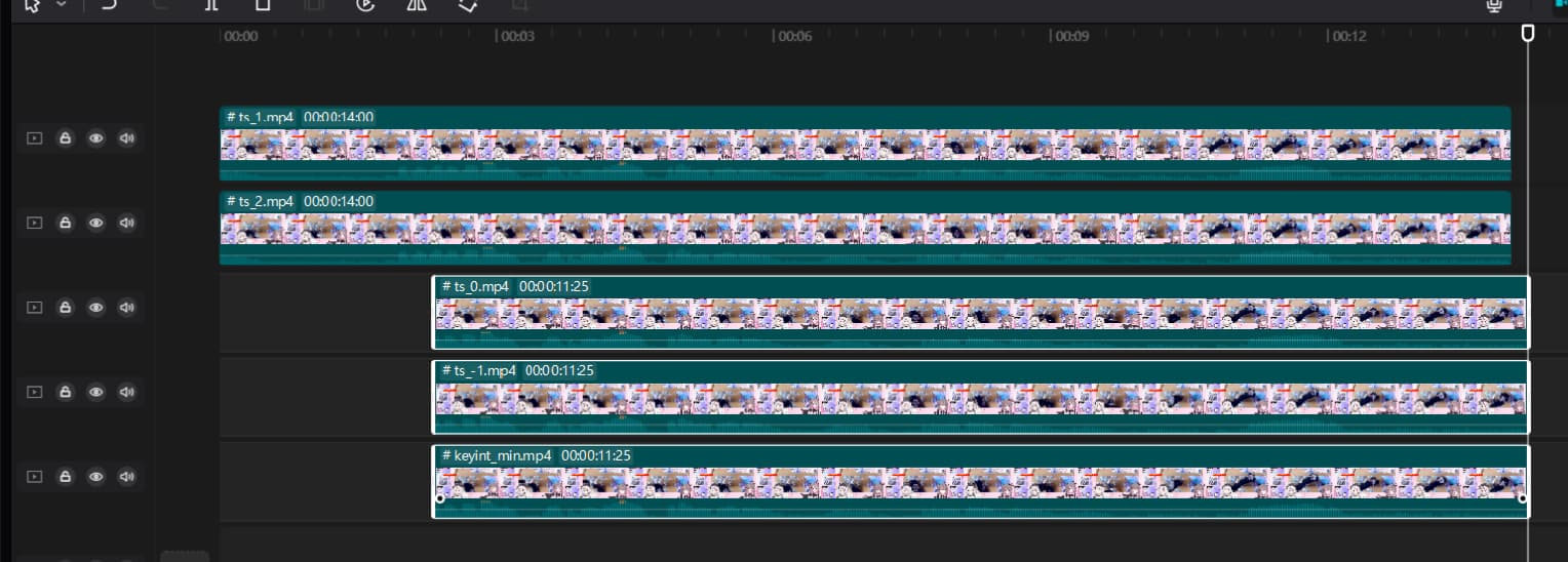 这是另一款剪辑工具剪映,轨道排列顺序相同,没有显示文件名。结论和剪映相同,但是注意,后边3个参数的文件缩略图不正常。