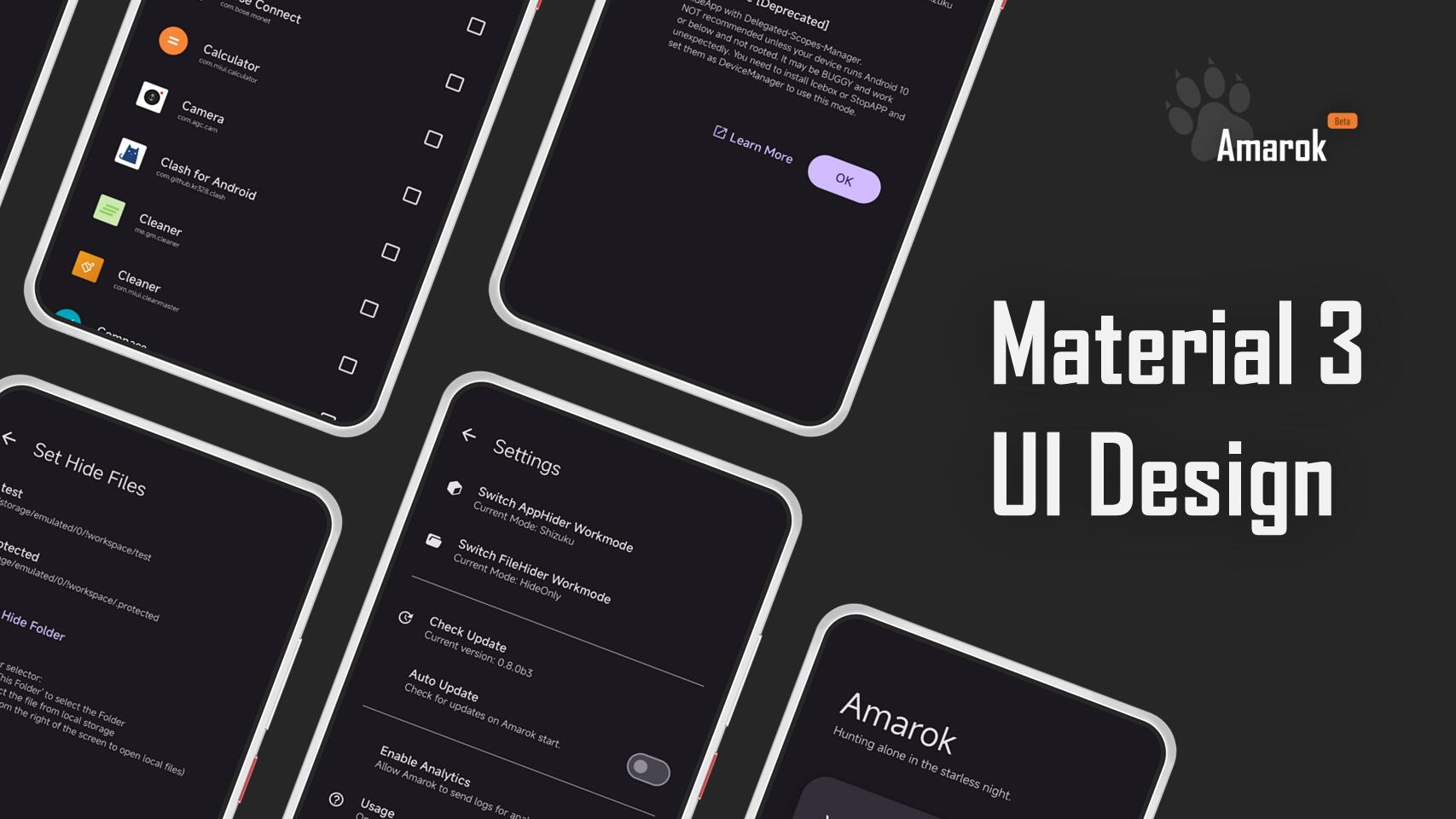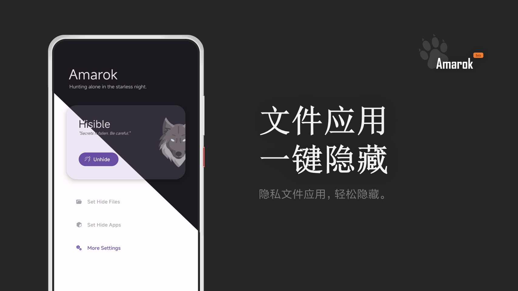 Amarok 是一款轻便的隐藏工具。它不对文件与应用进行加密,而是进行“隐藏”。它不加密文件内容,只混淆文件名以及文件签名,使文件“损坏”无法打开并且隐藏起来;Amarok 使用停用应用的方式“隐藏”应用,使它们在启动器中不可见。