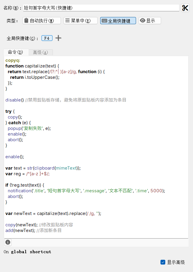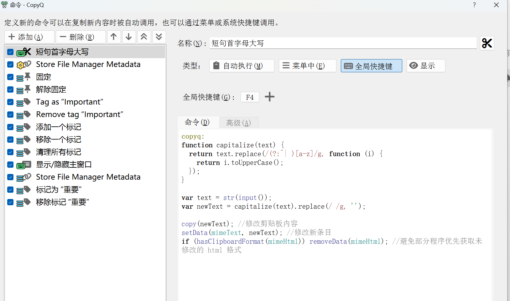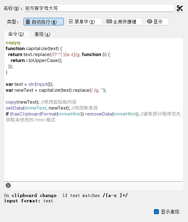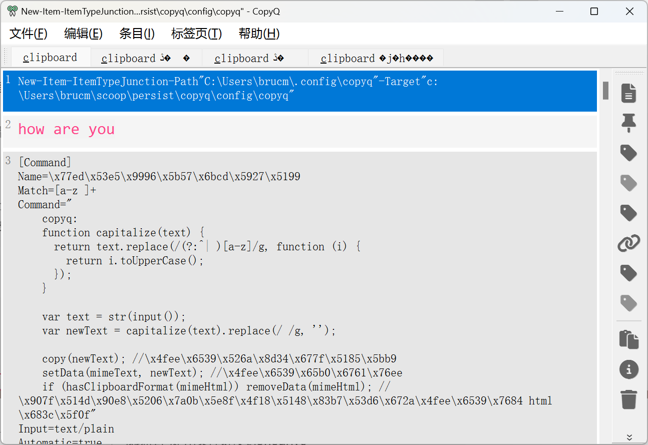 2.剪贴板格式化,比如 我复制了 how are you 执行 Action 自动格式化成首字母大写,并去掉空格 HowAreUou ,我看CopyQ 是支持脚本的,文档看得我一头雾水