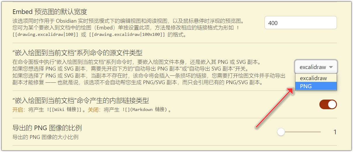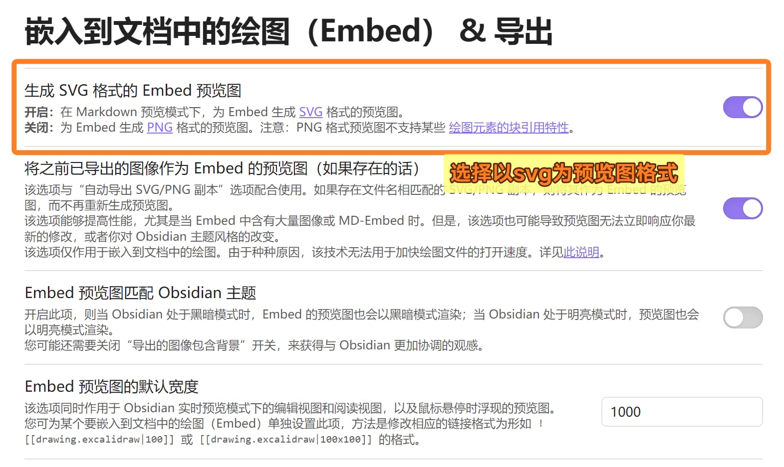 2、但是,嵌入 Excalidraw 源文件有个问题,在每次打开 .md 文件的时候实时解析,如果文件很复杂或者文件数量很多的时候会卡。我发现这个选项,可以嵌入一张 PNG 来作为预览图,应该可以很大程度上避免卡顿的问题,于是打开相关选项。