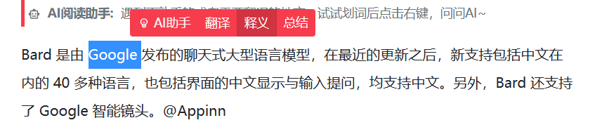该功能主要提供应用场景是用户在阅读中遇到需要翻译,或者需要名词解释的时候,可以通过鼠标划词,对目标文本进行高亮显示,然后右键点击,便可呼出AI助手工具条。