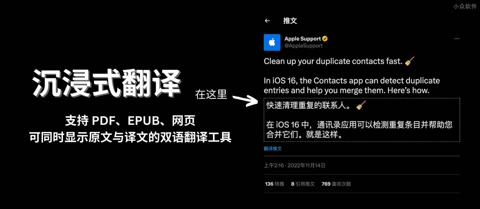 沉浸式翻译 是一款可同时显示原文与译文的双语网页翻译工具,有多种排版样式,能够智能识别网页主要内容区域,非常适合在线对照阅读。支持谷歌、DeepL、必应、彩云、有道、腾讯等 10+ 种翻译引擎,还可以对照翻译 PDF 文档、EPUB 电子书。@Appinn