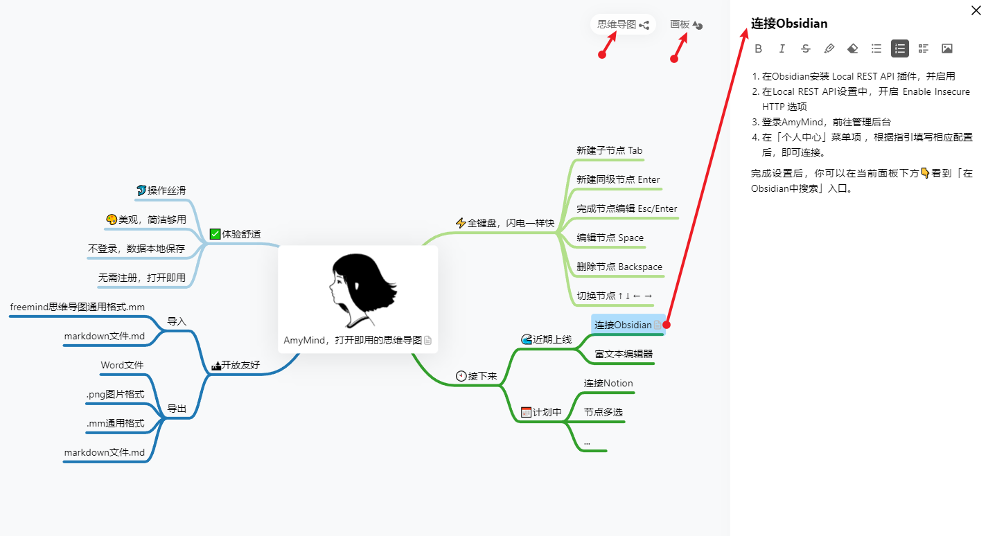 打开即用,支持常见的导入导出格式,支持与 Obsidian 和 Notion 联动,单节点可以是笔记模式。还可以画流程图。