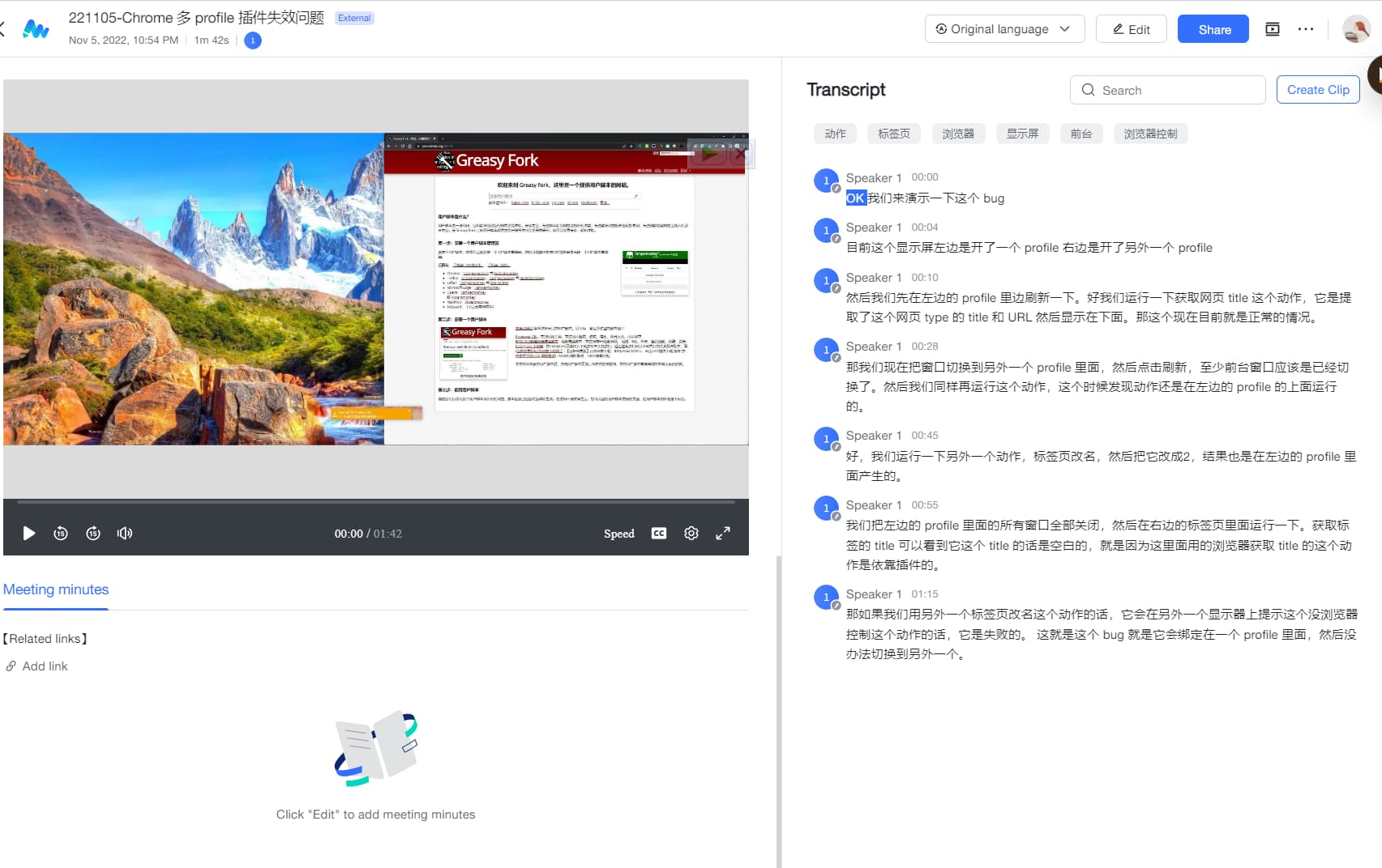 背景:平时用飞书妙记来学习一些课程。整体流程就是把课程传到妙记里,看转写的文字(比较快),然后点击到具体不懂的位置看画面。具体过程参考