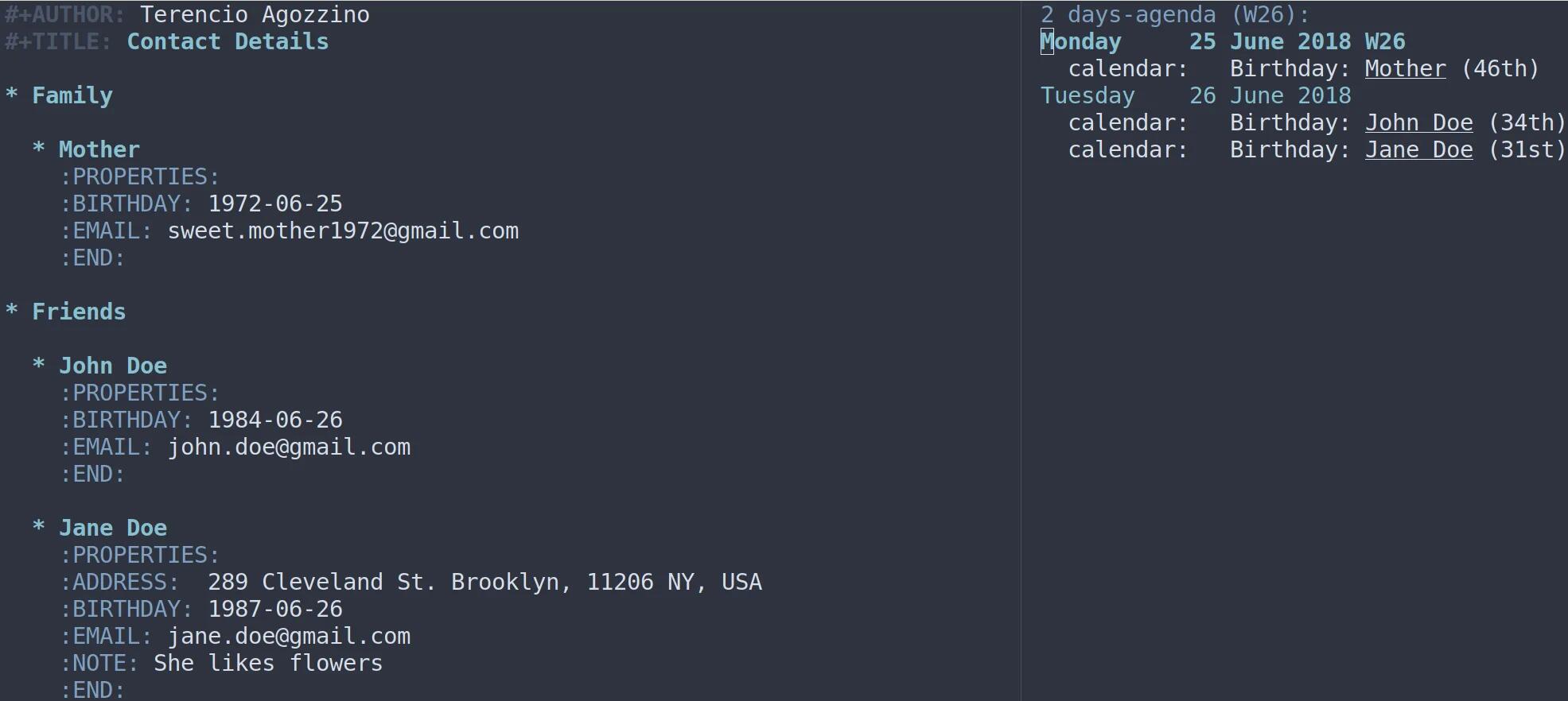 - 使用原因: 可以配合 org-vcard 导入导出手机联系人,用 org-ql 可以方便地搜索单个 property。用 org-capture 可以快速新增。在 org 笔记里可以很方便地添加联系人的 link。实现其他功能——例如生日提醒。
