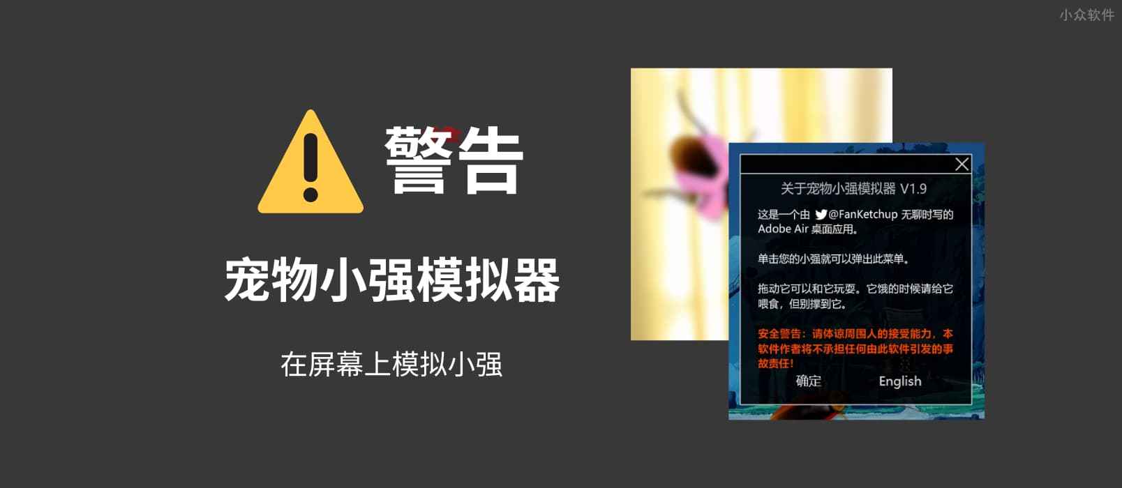 宠物小强模拟器是一款能搞让人血脉偾张的桌面宠物工具,基于已淘汰的 Adobe AIR 平台,支持在 Windows 与 macOS 上使用,它模拟了