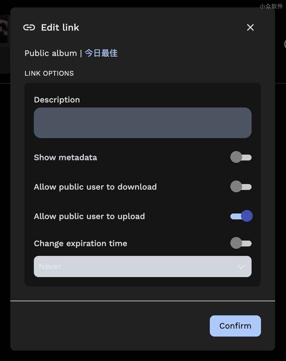 分享与上传就很赞了,你可以通过 Immich 将某个相册分享给好友,可以设置很多权限,包括:
