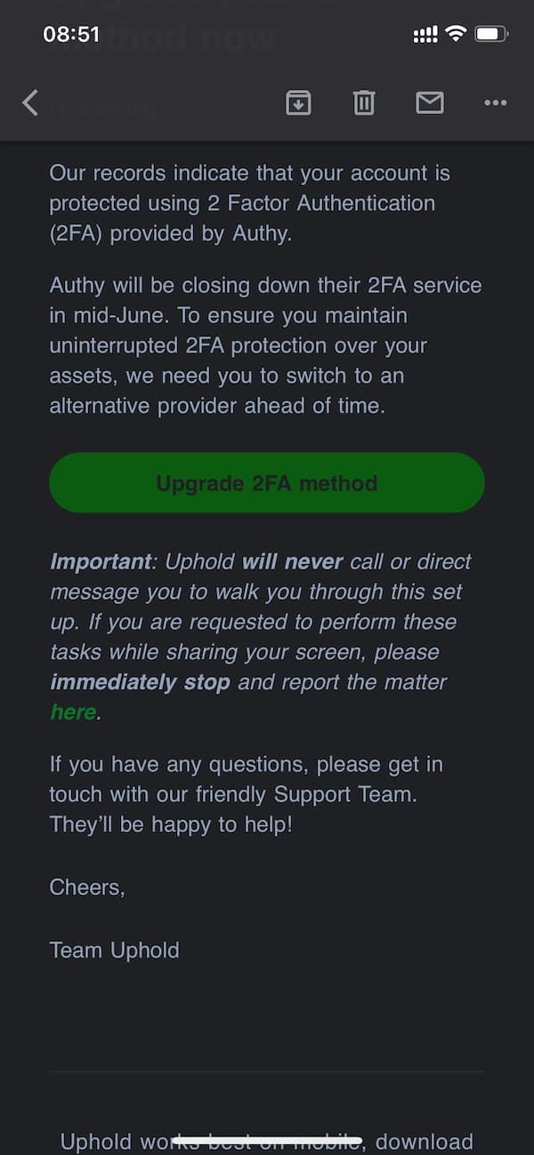 邮件来自 Uphold,目前还未在 Authy 官网发现任何消息。