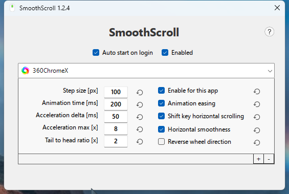 step size 滚一次的距离,大了的话也会导致滚动看起来变快,100px 大约是五、六行。如果遇到滚轮滚好几下页面才动的情况,说明数值小了,比如有些 PDF 阅读器,需要设置到几百 px 才行。此外,我还发现在这种情况下,animation time 和 Tail to head ratio 这两项也会导致页面不滚动,因此需要三项一起调节。