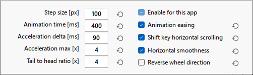step size 滚一次的距离,大了的话也会导致滚动看起来变快,100px 大约是五、六行。如果遇到滚轮滚好几下页面才动的情况,说明数值小了,比如有些 PDF 阅读器,需要设置到几百 px 才行。此外,我还发现在这种情况下,animation time 和 Tail to head ratio 这两项也会导致页面不滚动,因此需要三项一起调节。