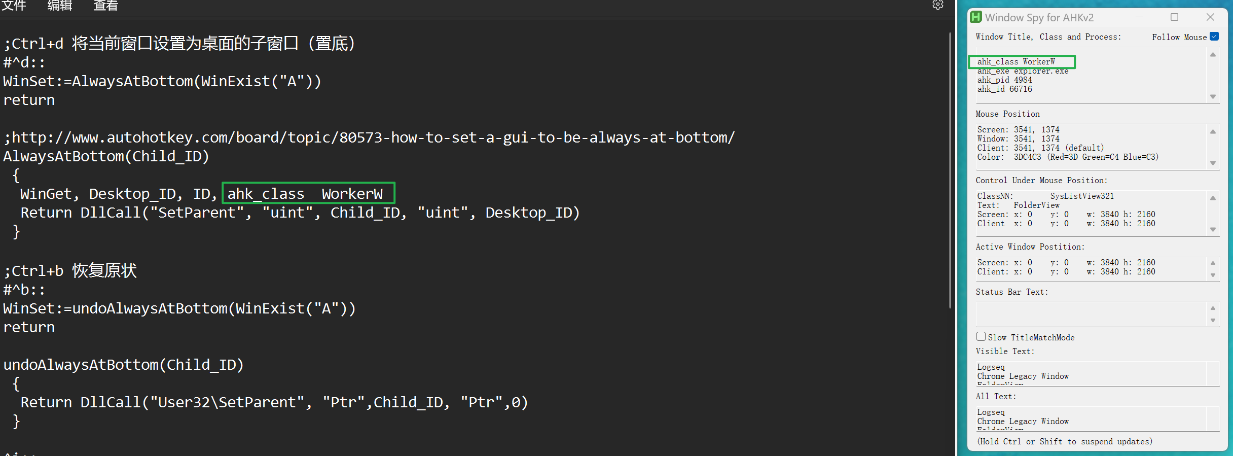 最近翻出了一个古老脚本,稍微改了一下,可以将某个窗口变为桌面的子窗口,即按下Win+D,该窗口不会最小化,且永远不会覆盖其他窗口,尤其适合待办事项、笔记窗口等需要强提醒的窗口。