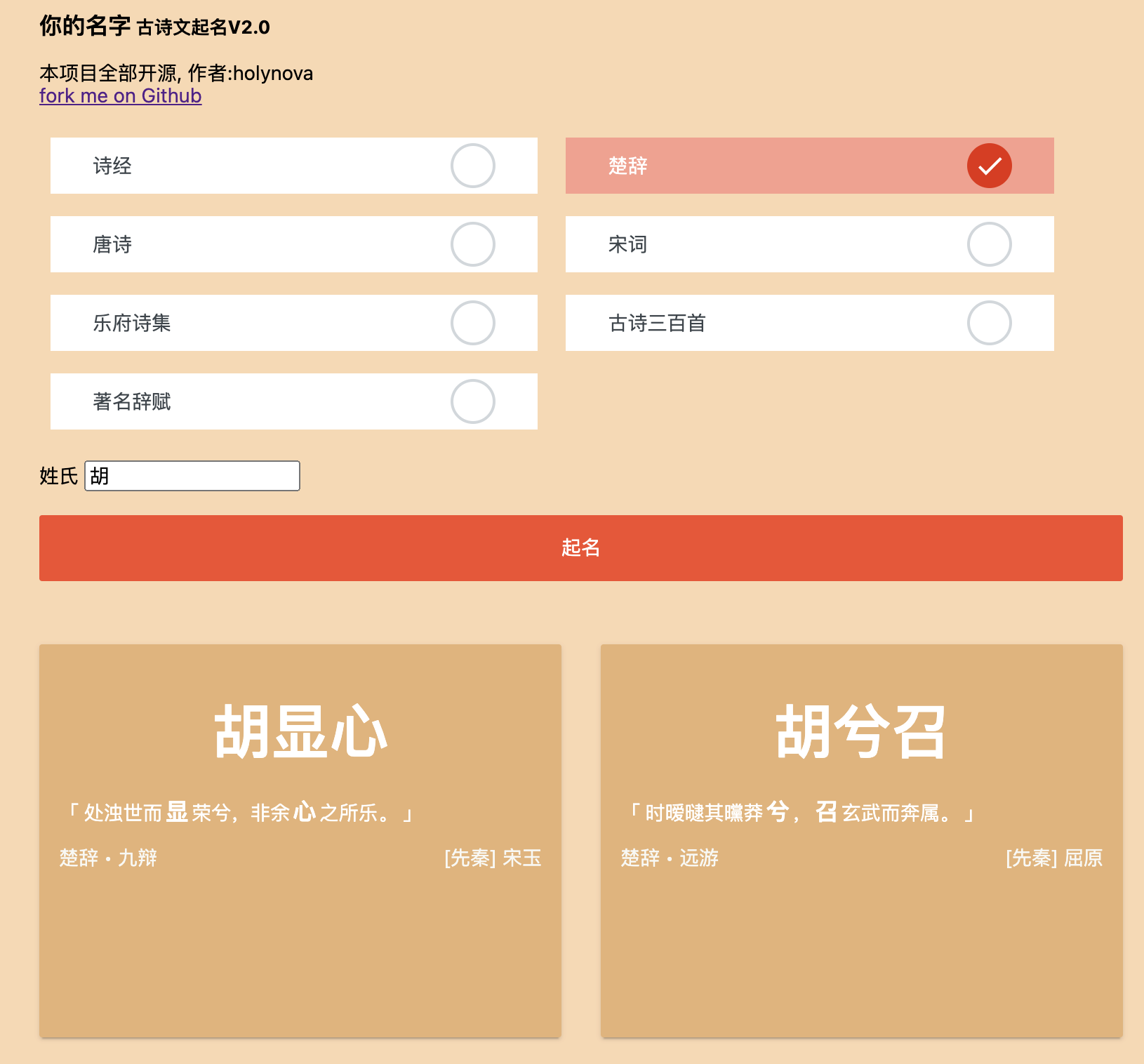 古诗文起名: 利用诗经、楚辞等给小朋友起名字。推荐给即将当父母的朋友,我当时给我家宝宝取名字真是绞尽脑汁,一看到这项目就必须支持了哈哈。