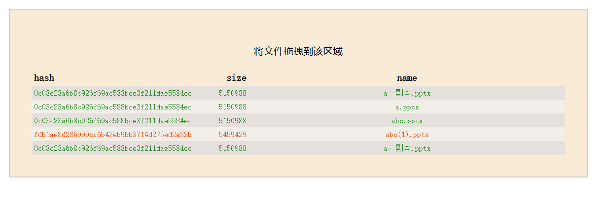 将文件拖拽到页面指定位置,就可以在页面中显示文件的sha1 hash值,可以拖入多个文件,同时得到多个文件hash值用于比对,以第一个文件的hash值作为标准,与之相同的显示为绿色字体,不同则为红色字体,这样,这些文件是不是相同文件一目了然。