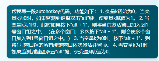 - 当变量k为0时,按下“alt + 1”,则将1号窗口组的所有绑定窗口依次激活并置顶。