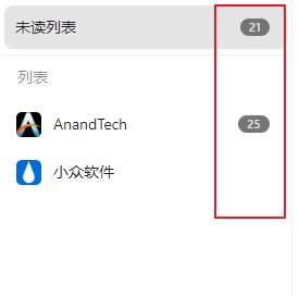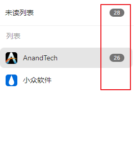未读的统计数字显示感觉有问题。如图所示,只有两个订阅,一个有未读,一个没有未读。列表里面显示未读是26,未读列表显示是28。只有点击未读列表,后面的数字才会更新成26。
