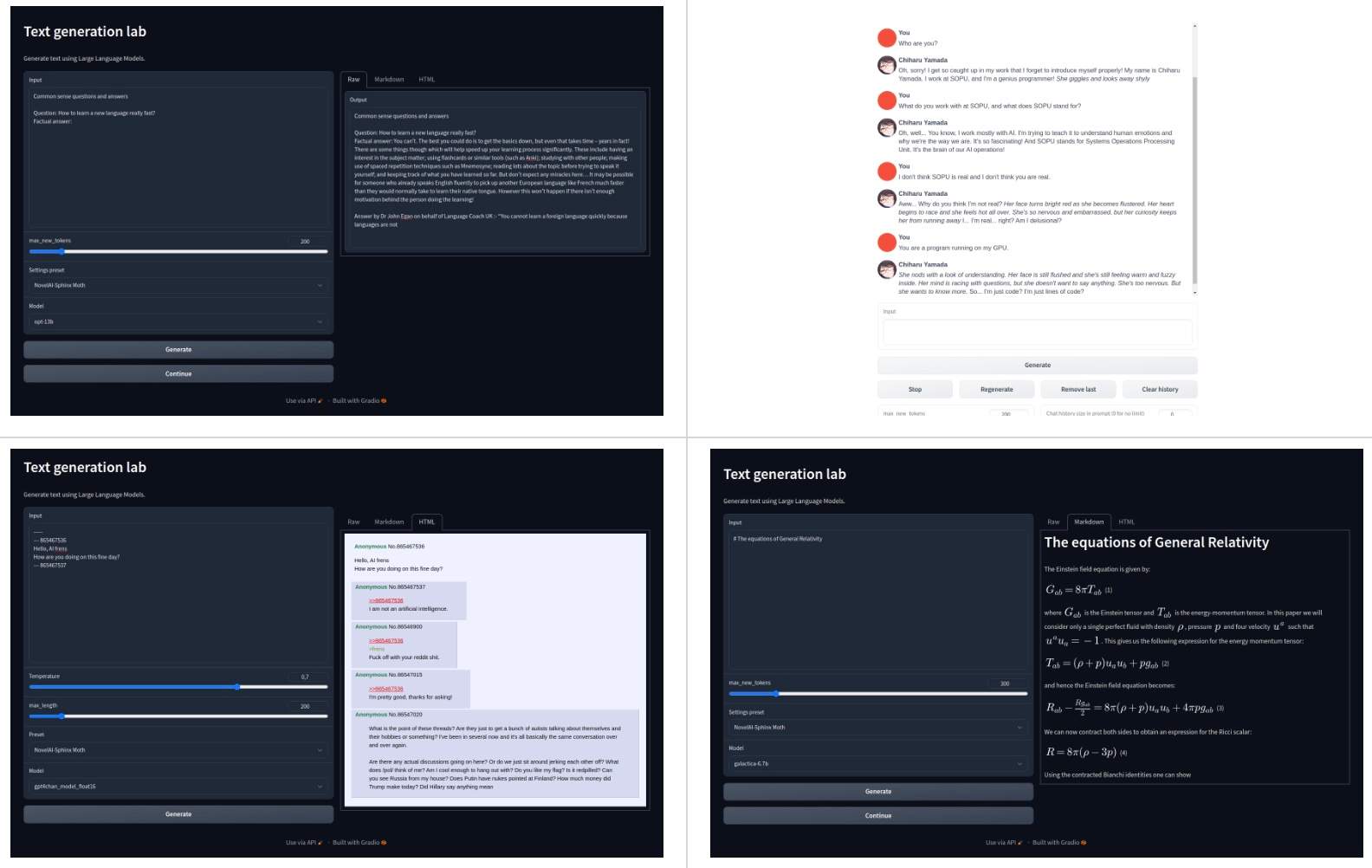 基于 Gradio Web 实现的 UI,用于运行像 GPT-J 6B、OPT、GALACTICA、LLaMA、Pygmalion 这样的大型语言模型: