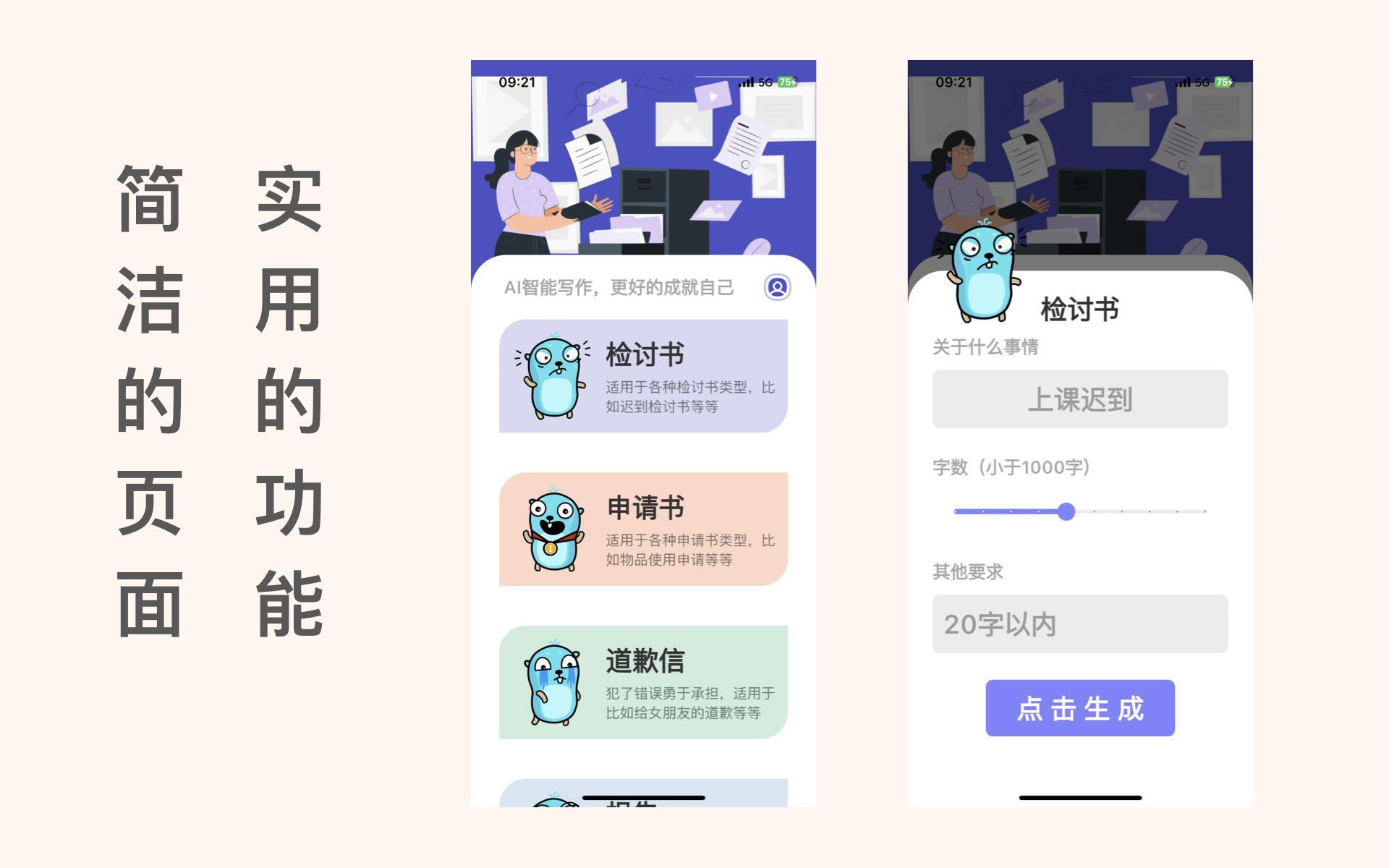 2.极简的操作方式,一键生成各种检讨书、保证书、道歉范文、表白情书等等。