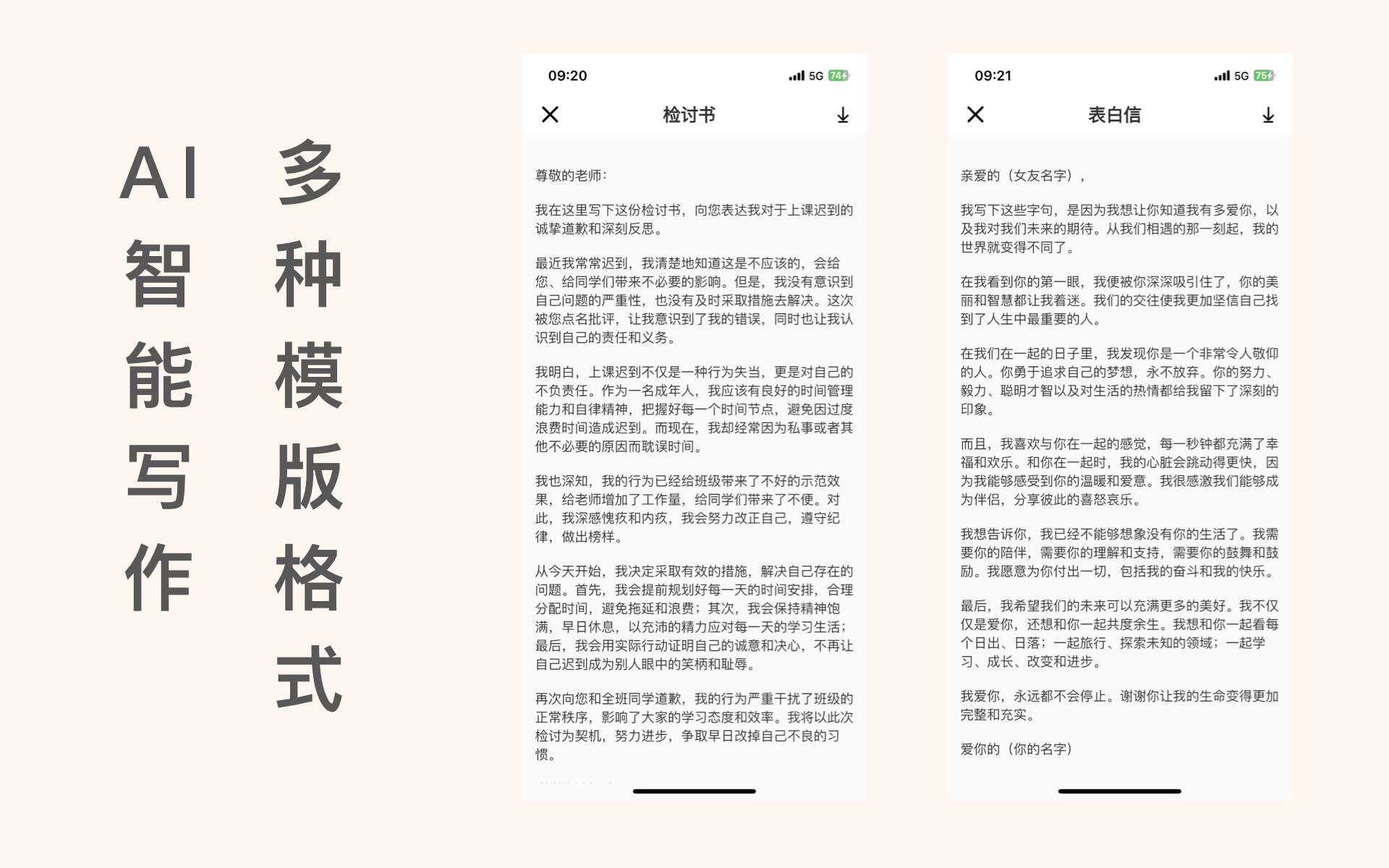 学生党,写手党的福音,AI智能写作,一键生成各种检讨书、保证书、道歉范文、报告、表白情书等等。