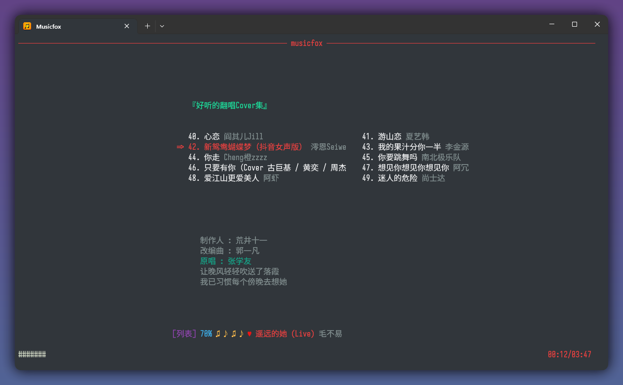 哦还有,我用系统自带的 MATE Terminal 运行 musicfox,配合等距更纱黑体,效果也挺不错的 ![]()