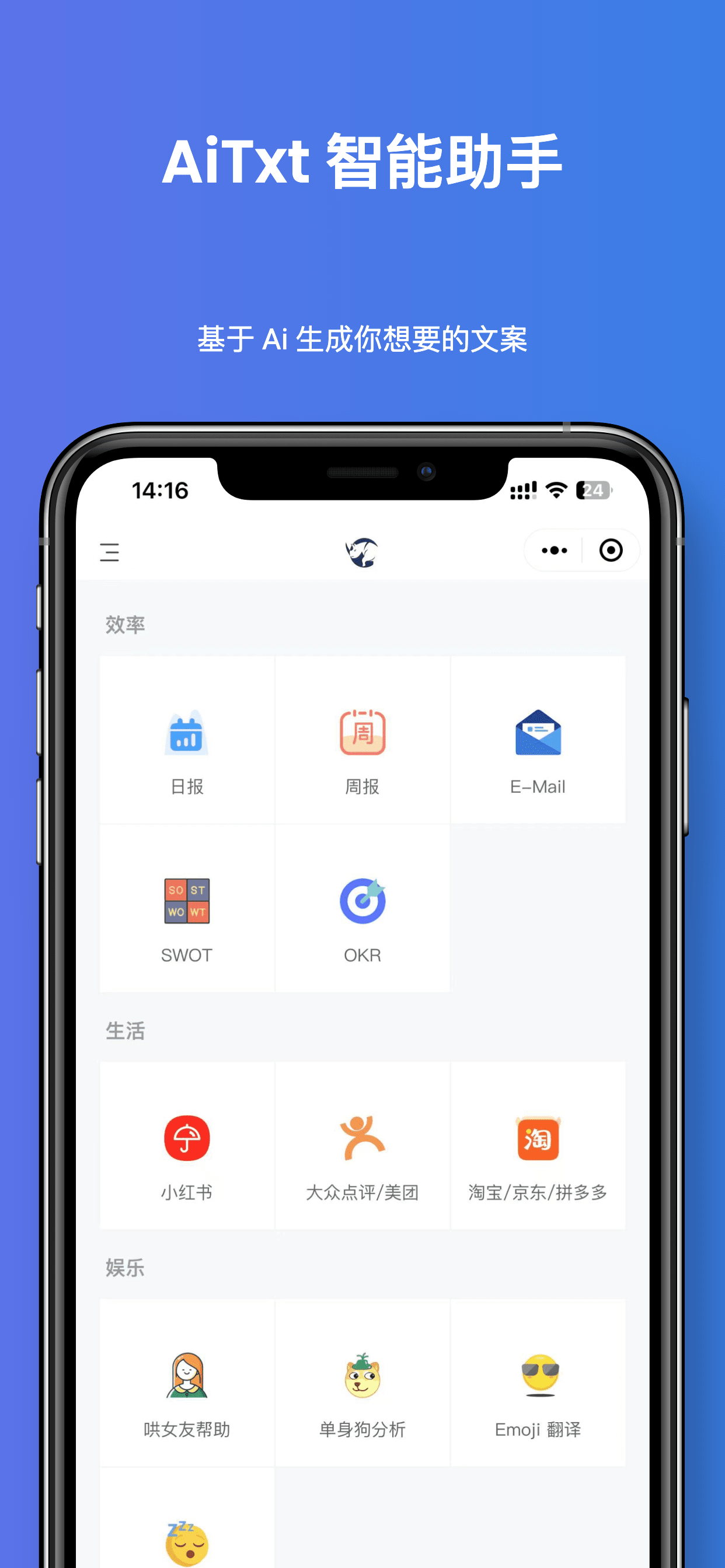 AiTxt 工具箱,目前支持很多功能,列如:小红书文案生成器、大众点评评价、淘宝商品评价、短视频创作脚本、日报/周报生成器、OKR/SWOT分析、佛陀对话、Ai诗人等十分实用的模块。