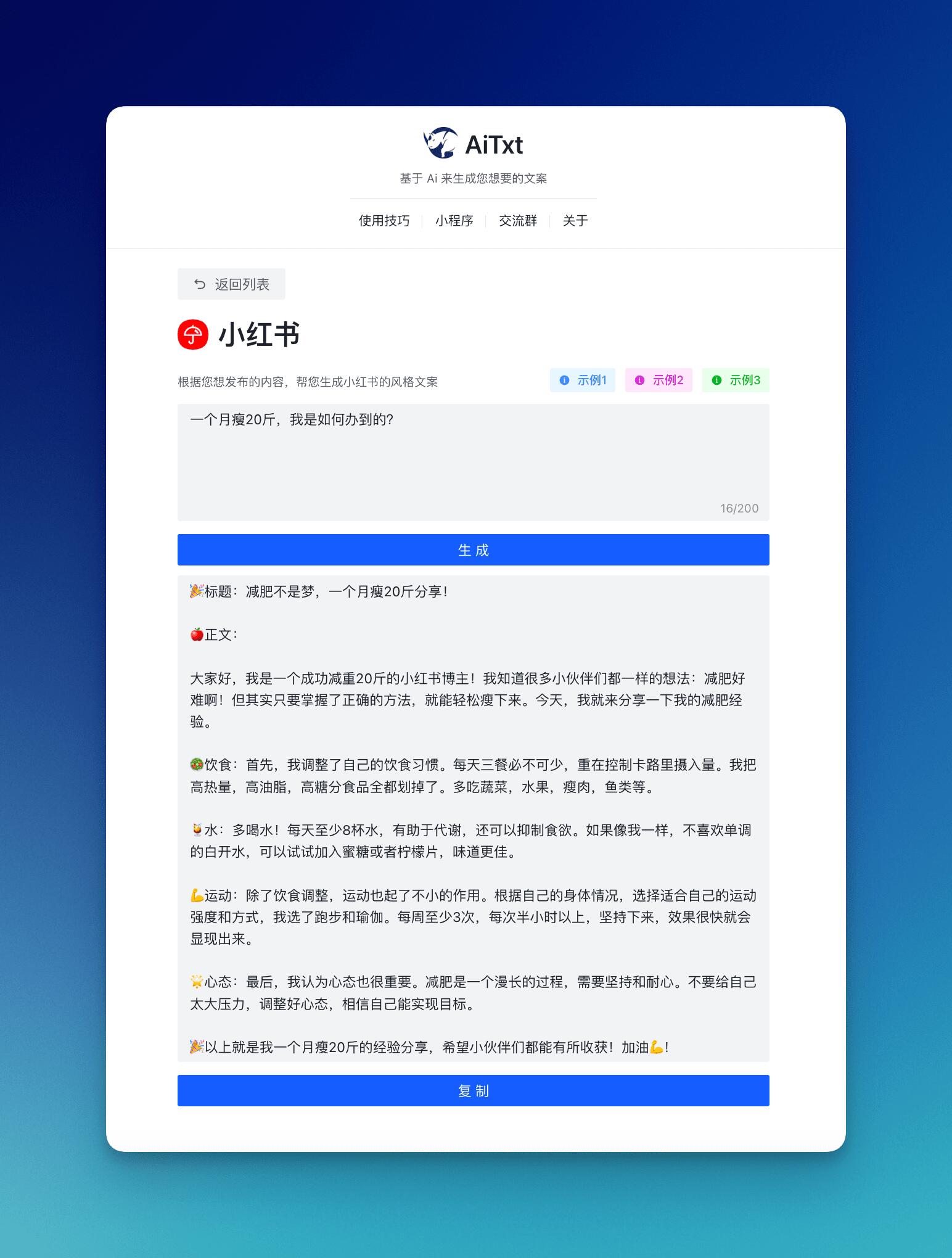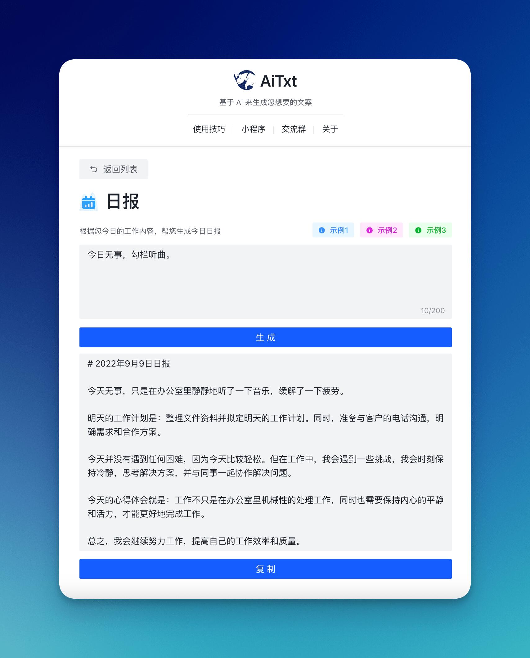 AiTxt 智能助手,基于Ai 生成你想要的一切文案,基于 ChatGPT 3.5 打造一个更适合普通人使用的 Ai 工具箱。