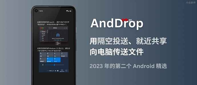 AndDrop 是一款非常赞的 Android 应用,它通过 Mac 自带隔空投送、Windows 自带就近共享两个系统功能, 来向 Mac、Windows 电脑传送文件。简单易用,无需在电脑安装客户端。是小众软件 2023 年的第二个精选。@Appinn