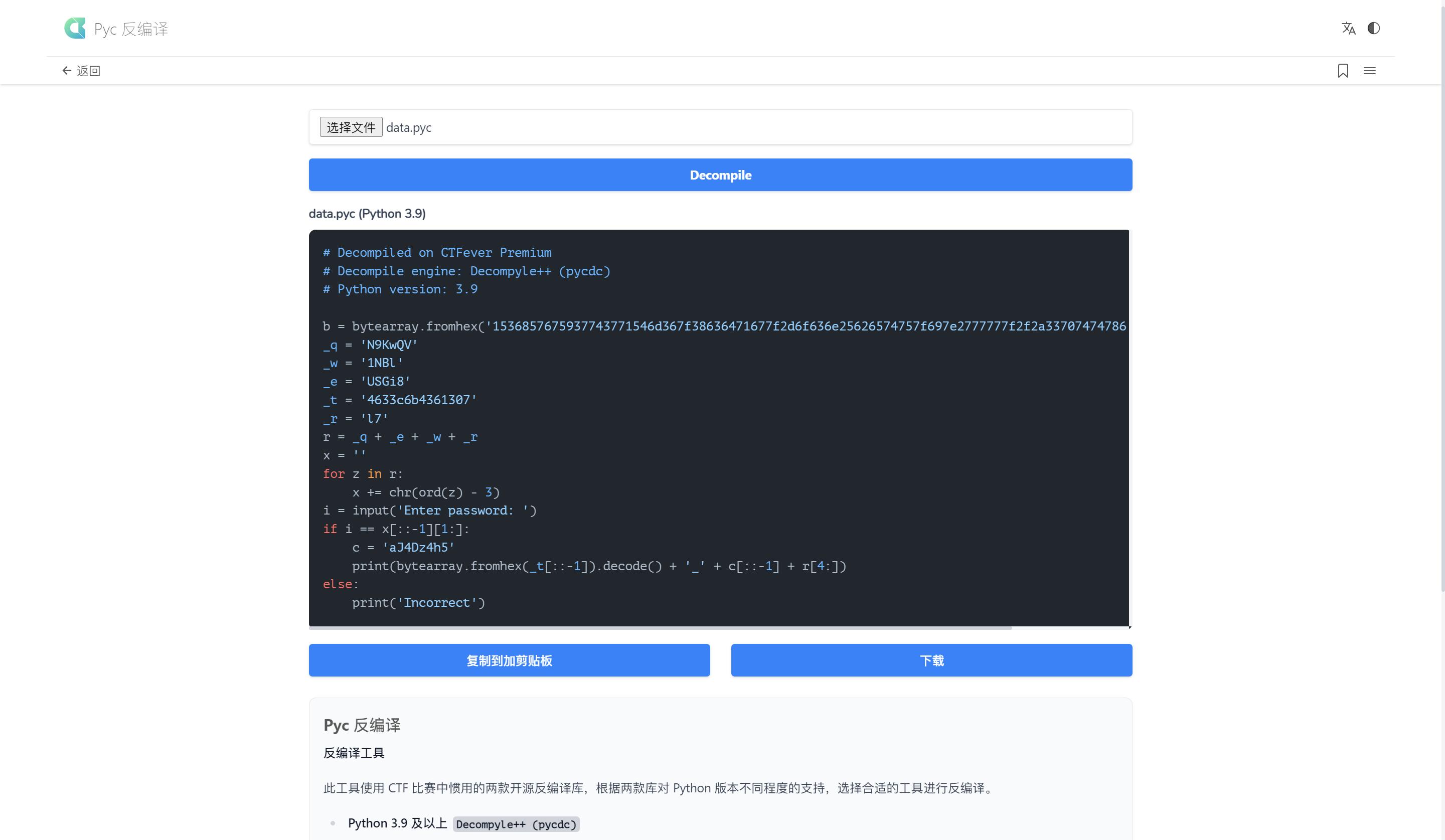 CTFever 是一个为 CTFer 和所有人准备的在线实用工具箱,提供 pyc 反编译、binwalk、端口扫描、Zip 伪加密检测,以及多种加密、编码和各种实用工具。