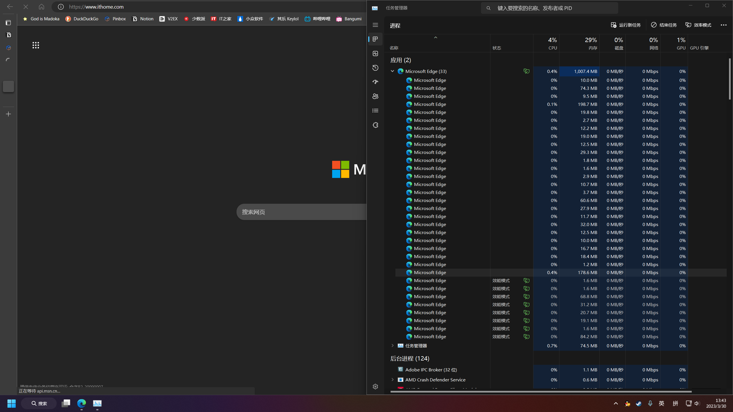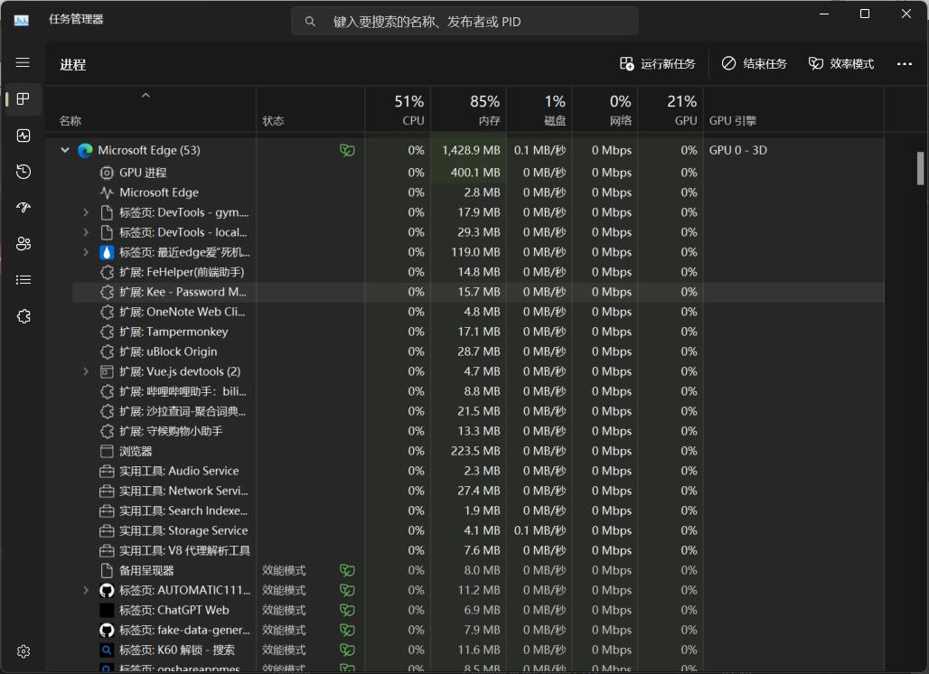 任务管理器,可以查看edge的里面的子进程,仔细看一下哪个资源占用不正常