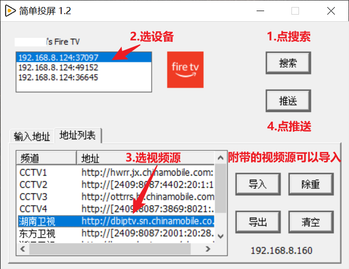 2.支持手动输入直播源地址,电脑直接投屏电视
