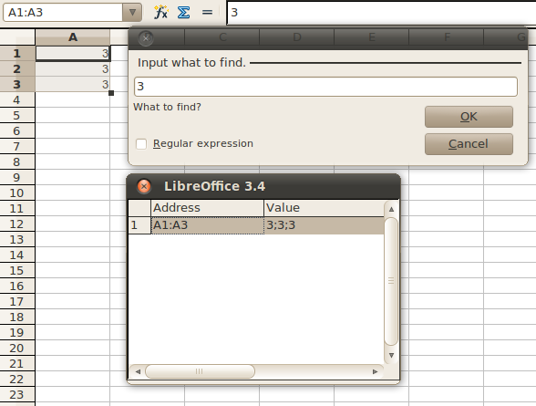 Search in Calc 是为 LibreOffice Calc 开发的扩展程序,用来搜索表格里面的内容,并通过额外的弹出窗口将匹配的单元格列举出来,勾选 Regular expression 就可以运用正则表达式查询。