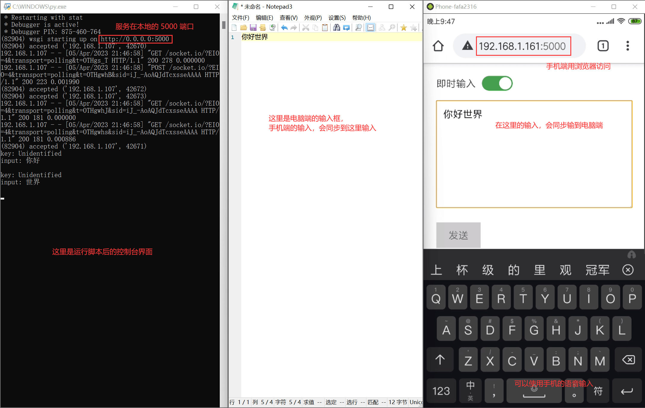 我写了一个脚本,绑定一个 http 服务,用另一个设备的浏览器打开后,在里面输入文本,可以捕获输入文本、按键,同步到 server 端。主要用途是:在电脑上运行这个服务,在手机浏览器上打开这个页面,就可以在手机端进行语音输入,将键入事件同步到电脑端。