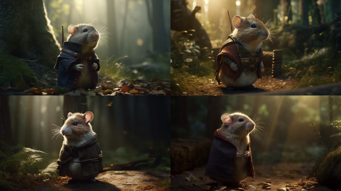 In the forest, Hamster, Stand, Walk, Bow head, Contemplation, Medieval clothing, cinematic lighting, ray tracing, from side --ar 16:9 --v 5 --q 2 --s 750