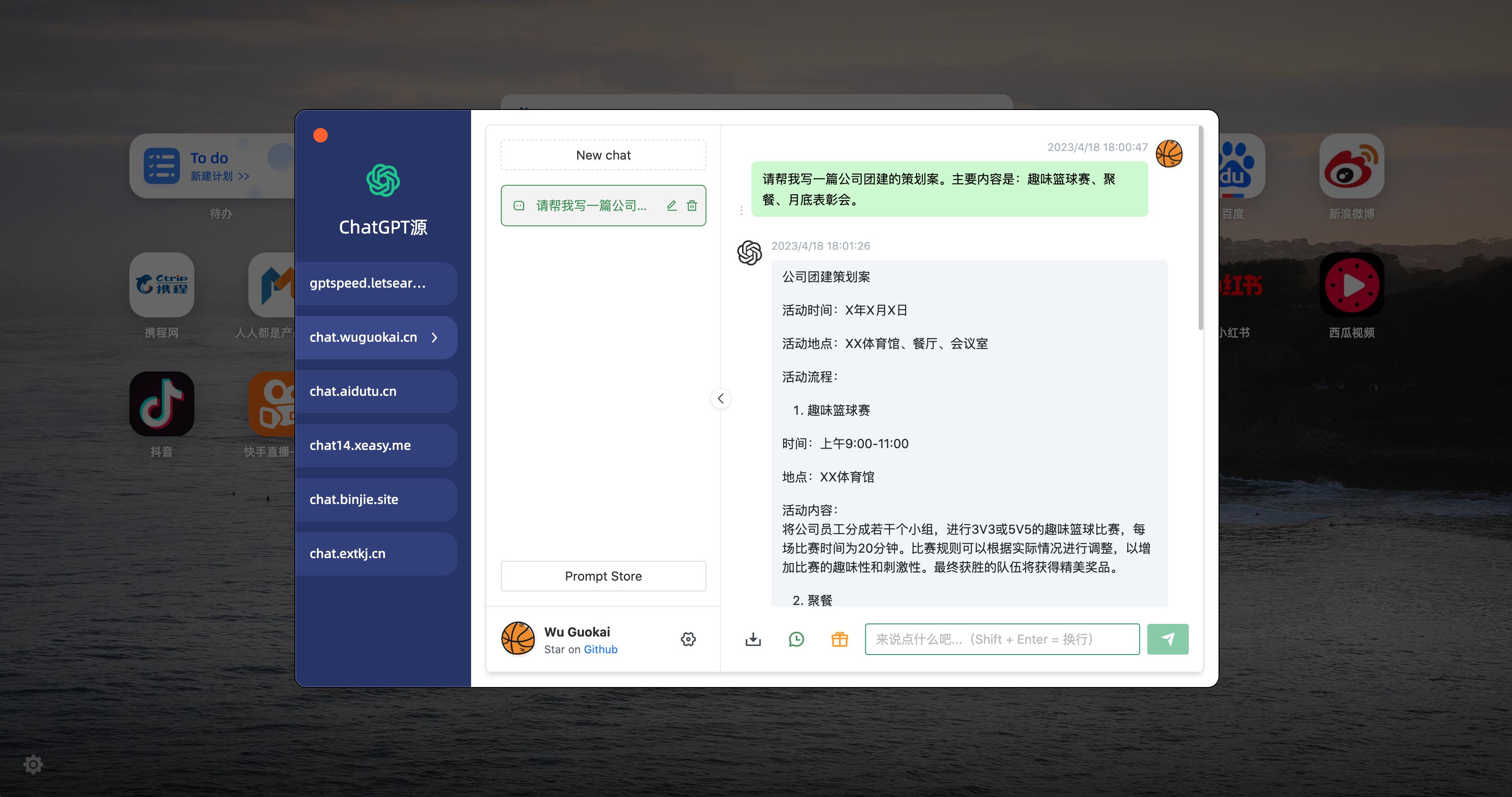 自带的chatGPT小组件内置6个接口可切换,无需魔法和注册,完全免费使用,并且反应迅速,各种文案策划都可以帮你搞定了。
