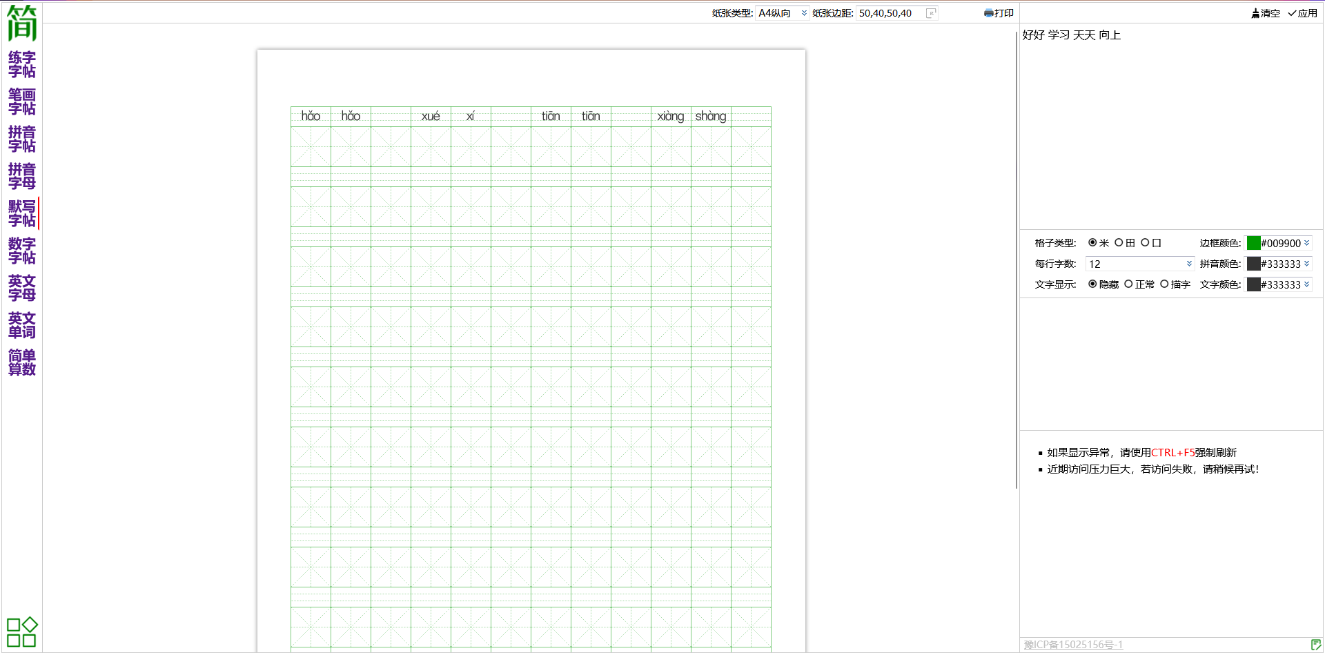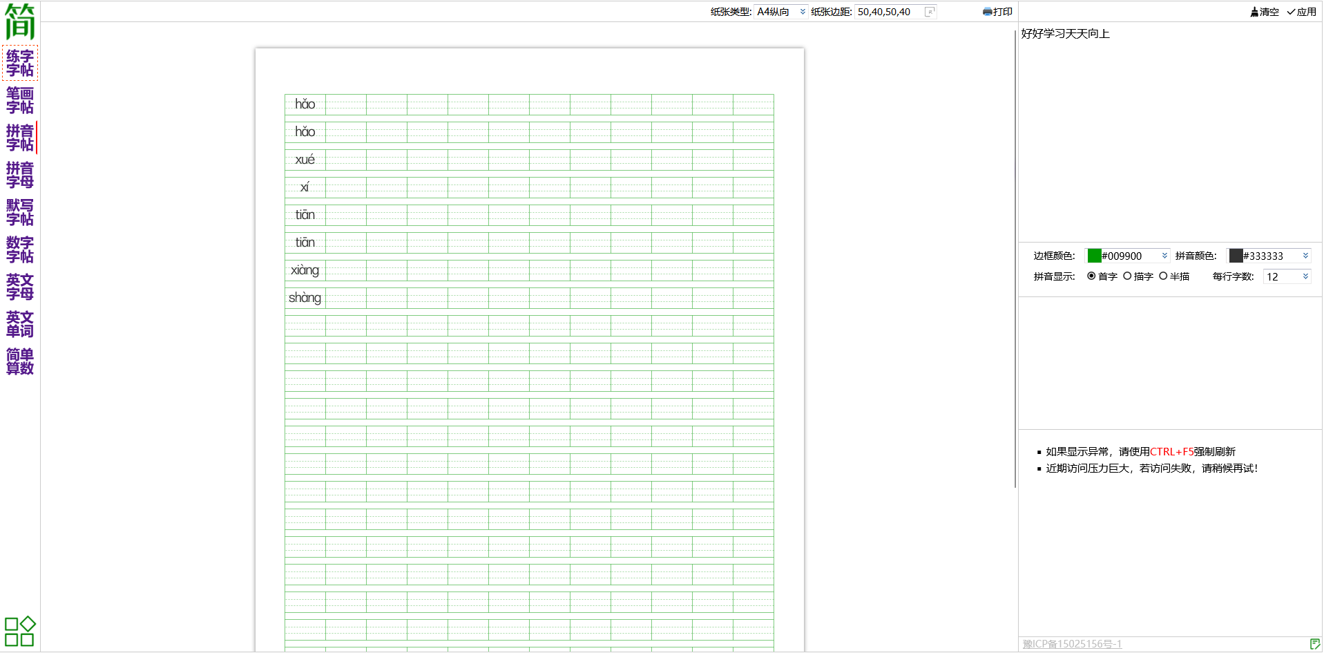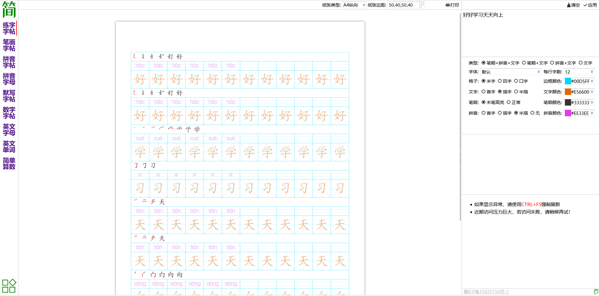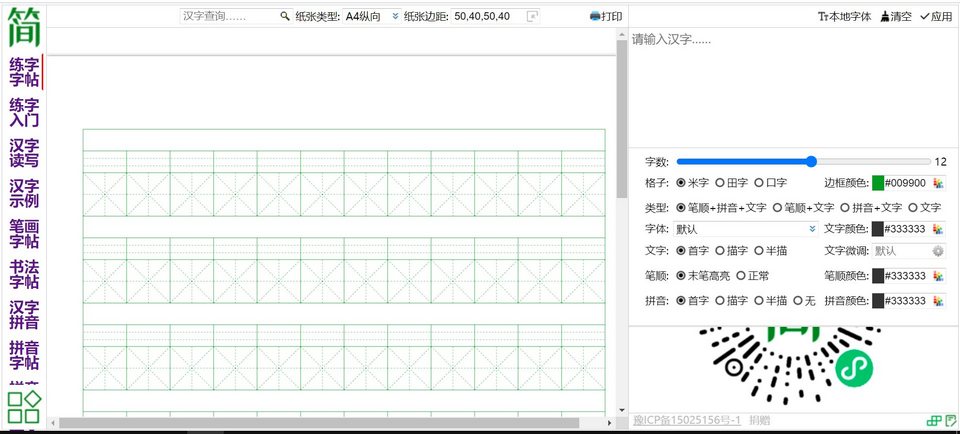 在线免费字帖,有可自定义笔顺、拼音、字体的练字字帖,也有拼音、数字、英文字帖,可选打印尺寸能调节边距,完美实现在线打印。很适合有练字需要的朋友!