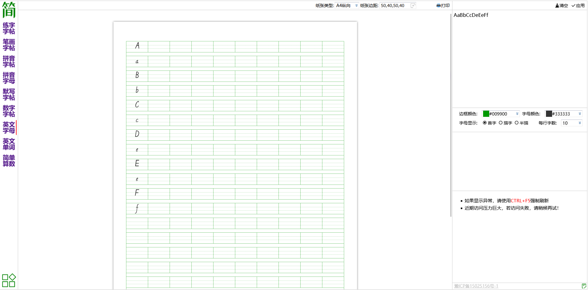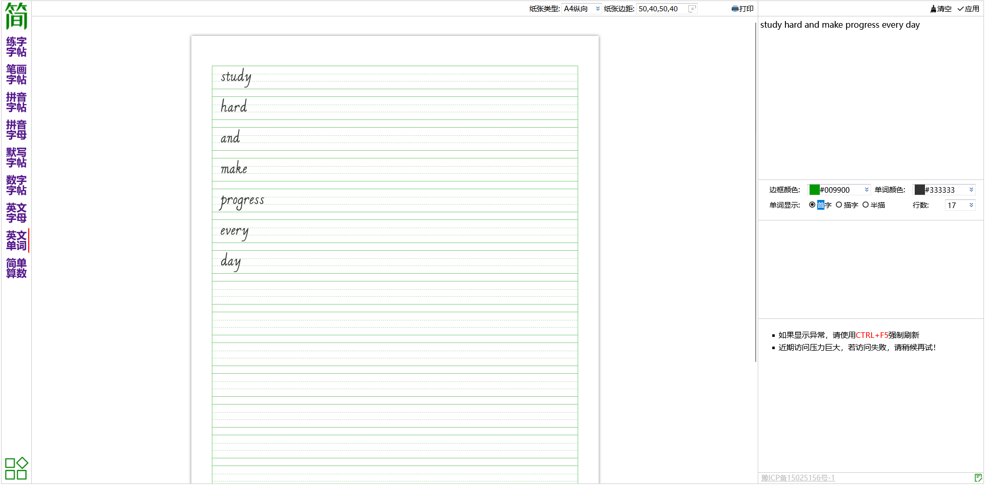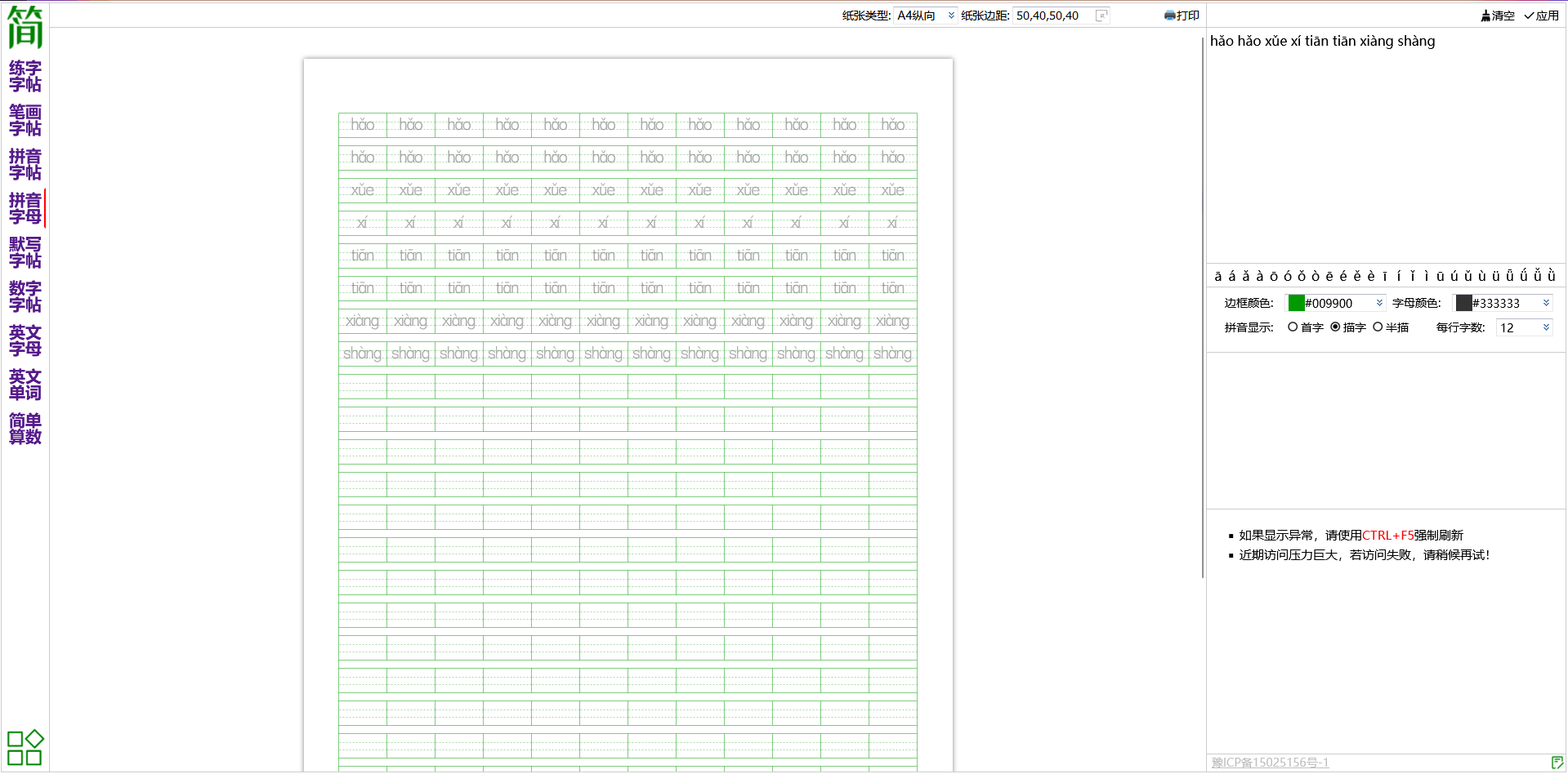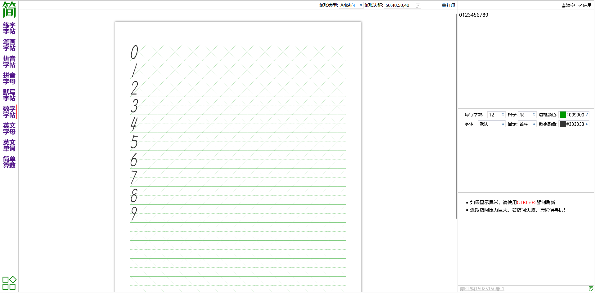 在线免费字帖,有可自定义笔顺、拼音、字体的练字字帖,也有拼音、数字、英文字帖,可选打印尺寸能调节边距,完美实现在线打印。很适合有练字需要的朋友!