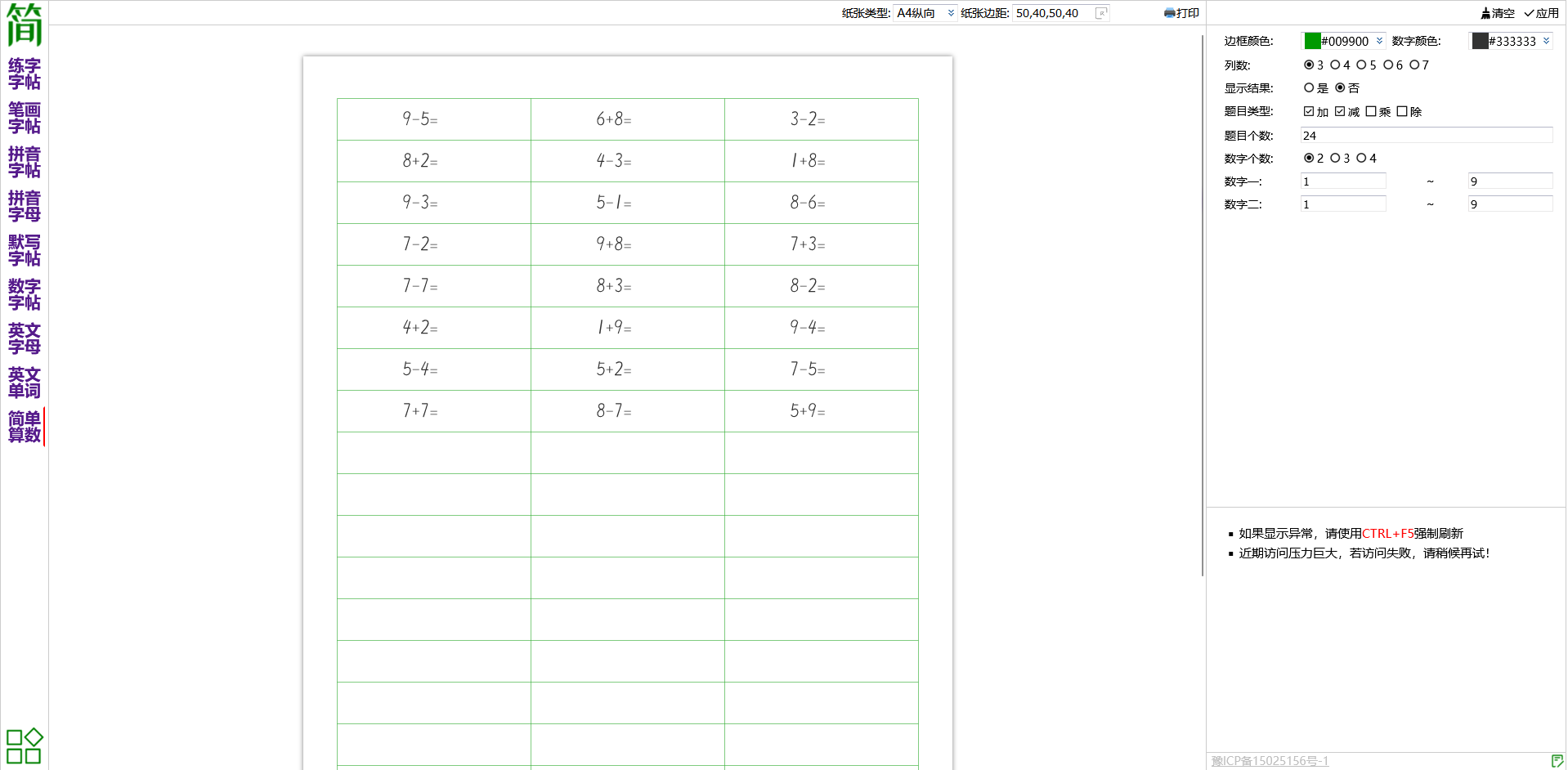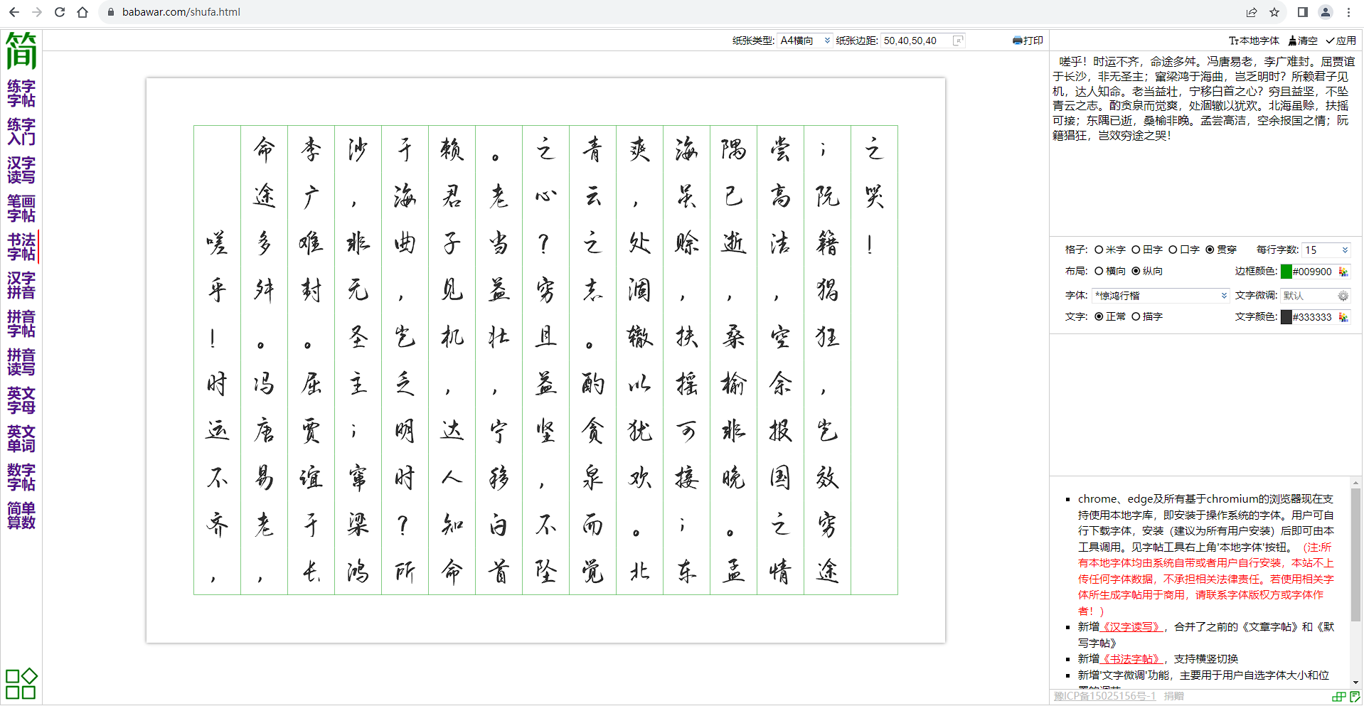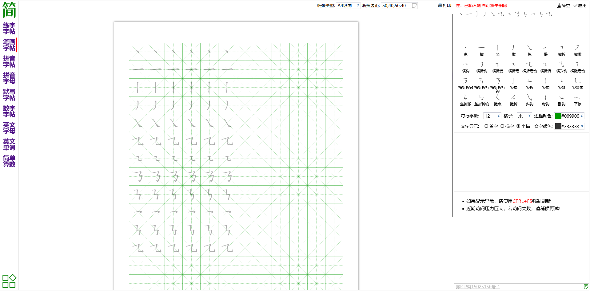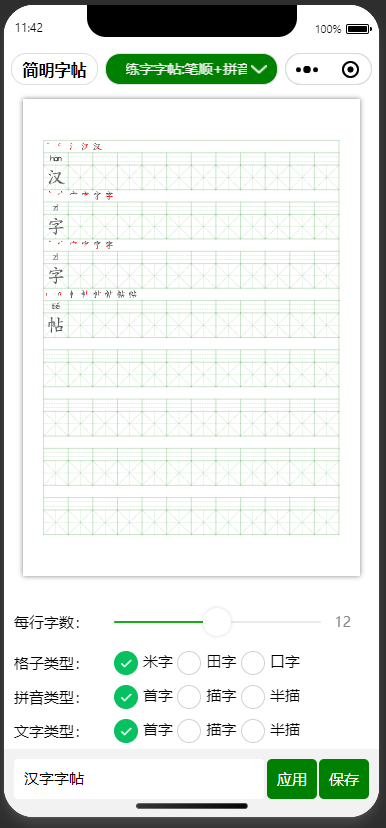 在线免费字帖,有可自定义笔顺、拼音、字体的练字字帖,也有拼音、数字、英文字帖,可选打印尺寸能调节边距,完美实现在线打印。很适合有练字需要的朋友!