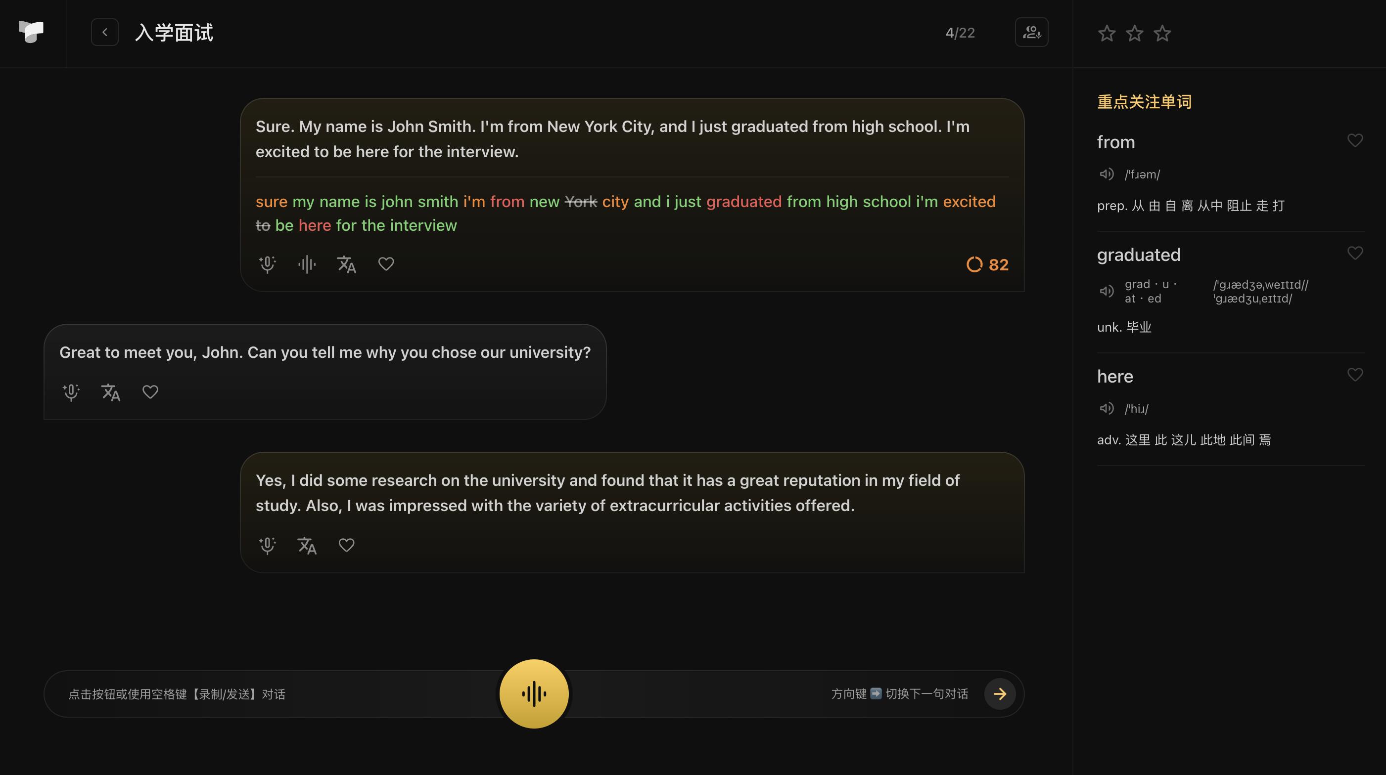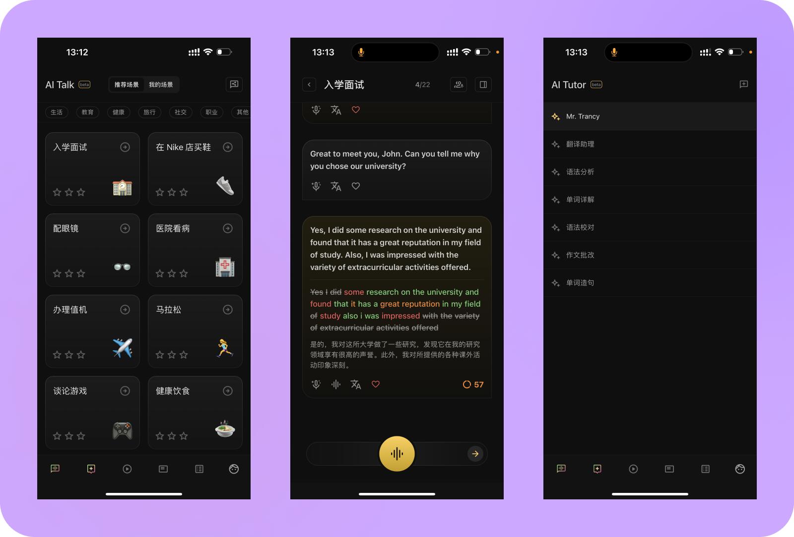 相较于其他AI口语练习应用,我们提供了多种训练模式,满足各种语言等级的用户