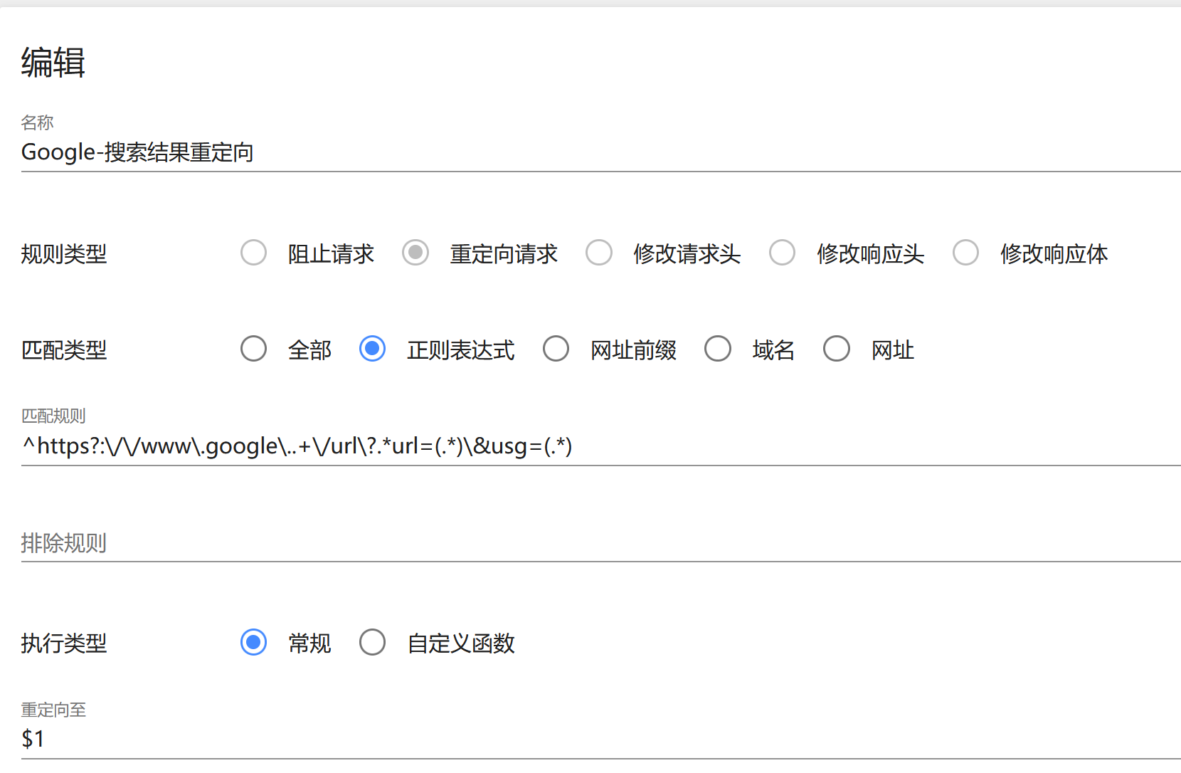 正则匹配^https?:\/\/www\.google\..+\/url\?.*url=(.*)\&usg=(.*),重定向到$1