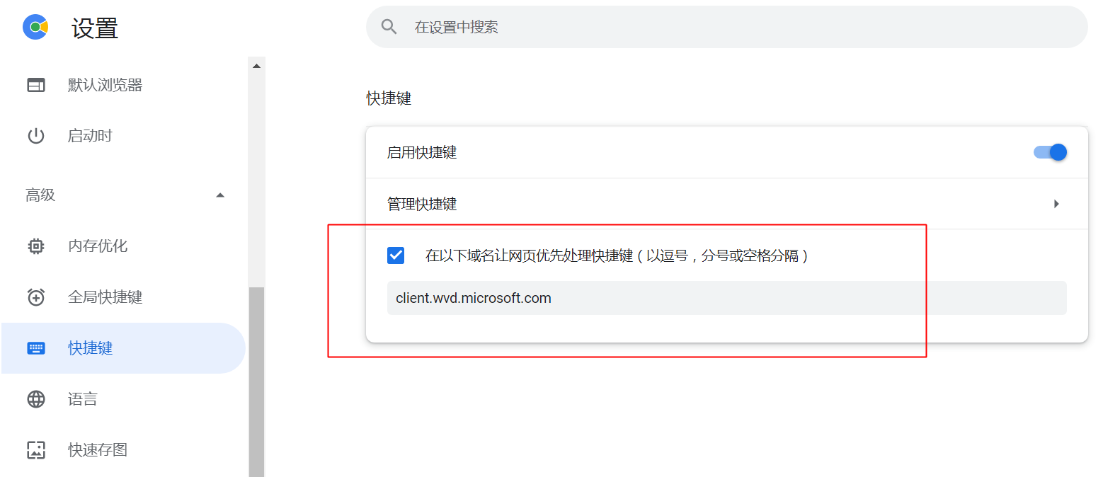 举个例子,我想关闭远程桌面中的浏览器的tab,按下了ctrl+w,结果会把远程桌面的tab给关掉。我需要的是针对这个网址让远程桌面中的浏览器优先处理快捷键。