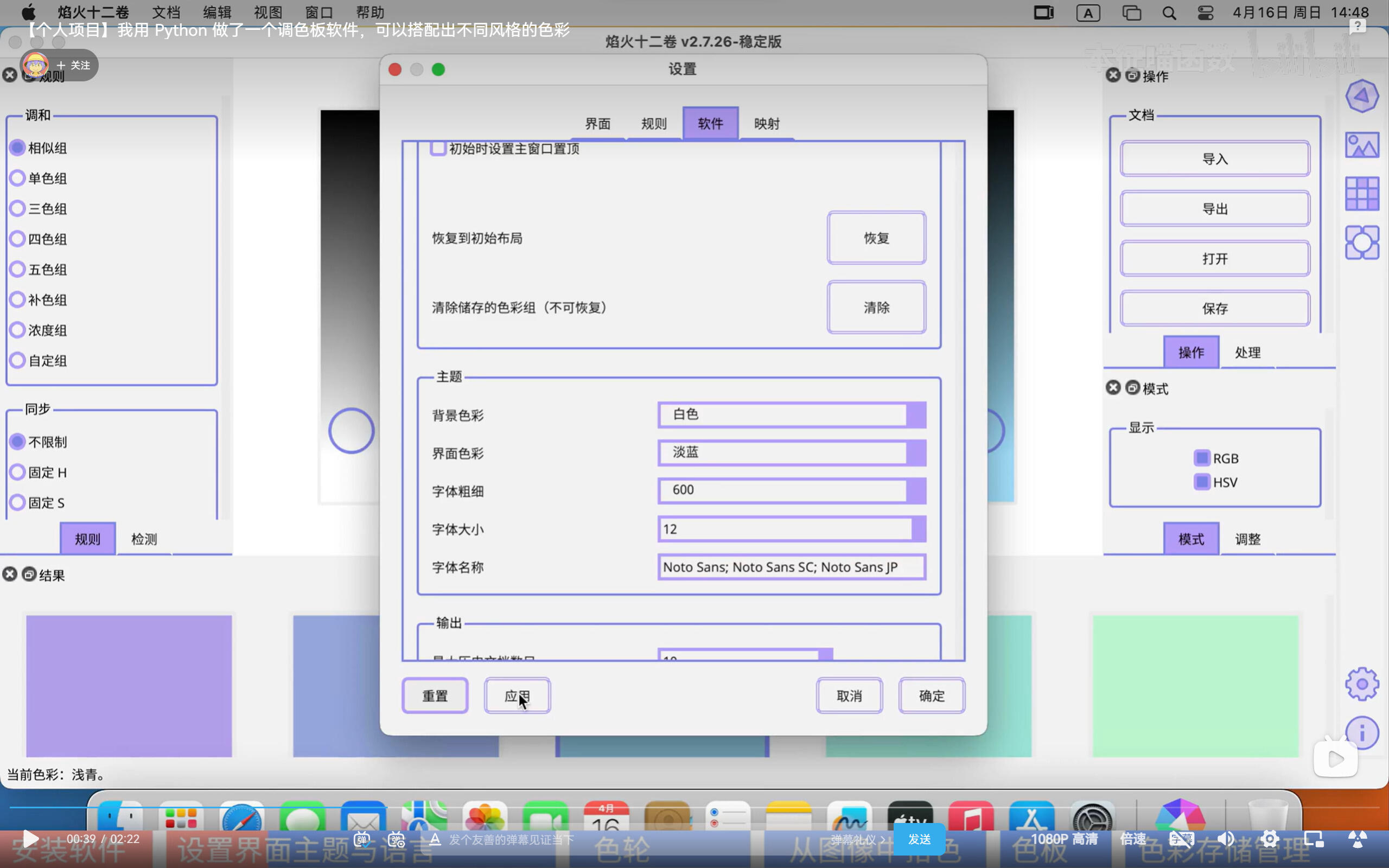 界面布局是借鉴的 Adobe Color,最初的想法就是 Adobe Color 不给保存和导出色板,又不想每次打开PS就为了配一组色彩,所以就想着自己写一个调色软件。适配 macOS 的界面调试我也没办法,之前在虚拟机上安装 macOS 不让联网,一连网就会验证设备,然后强制关闭,一个月后直接打不开了。