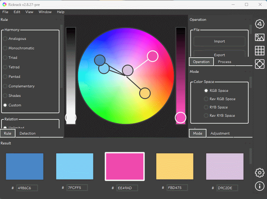 其实我是不建议用户随意更换软件的,有用着顺手的就行,没必要为了用开源软件而用开源软件,或者为了用小众软件而用小众软件。我开发这款软件是因为我比较喜欢 Adobe Color 的风格,但我想要的一些功能 Adobe Color 没有。我的目标并不是想做一个开源的 ColorSchemerStudio 或者开源的 Adobe Color,把所有软件的风格都融合进来做一个缝合怪没必要。