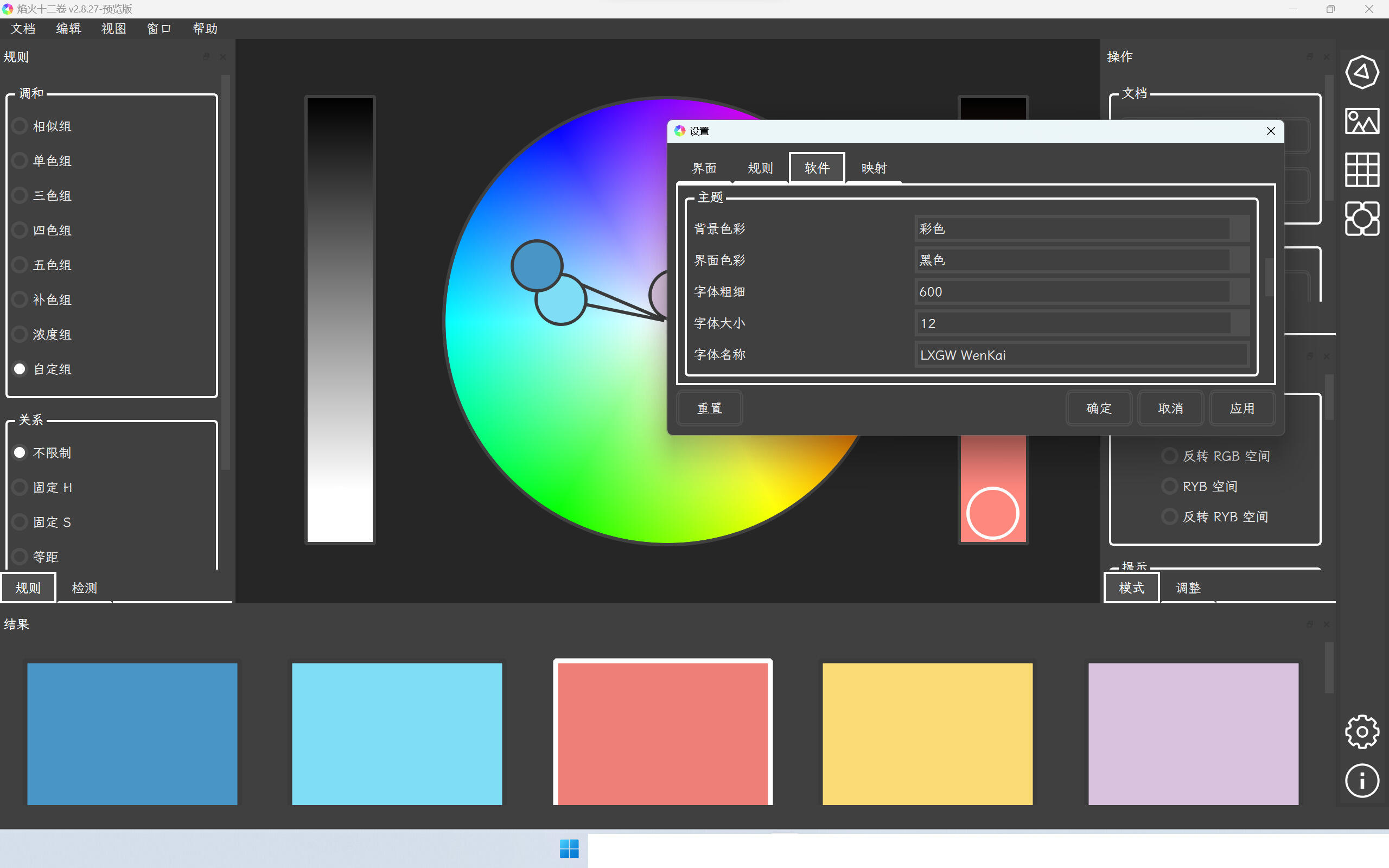 红黄蓝色轮之前有人提过,但毕竟不是标准色彩空间。现在没太多空闲时间写代码,零碎的时间写代码太难受了,以后有空的话可以考虑实现一个。界面皮肤其实可以自定义的,在设置里提供了几种不同的配色,修改"安装目录/styles/default.qss"可以定制界面按钮的样式。