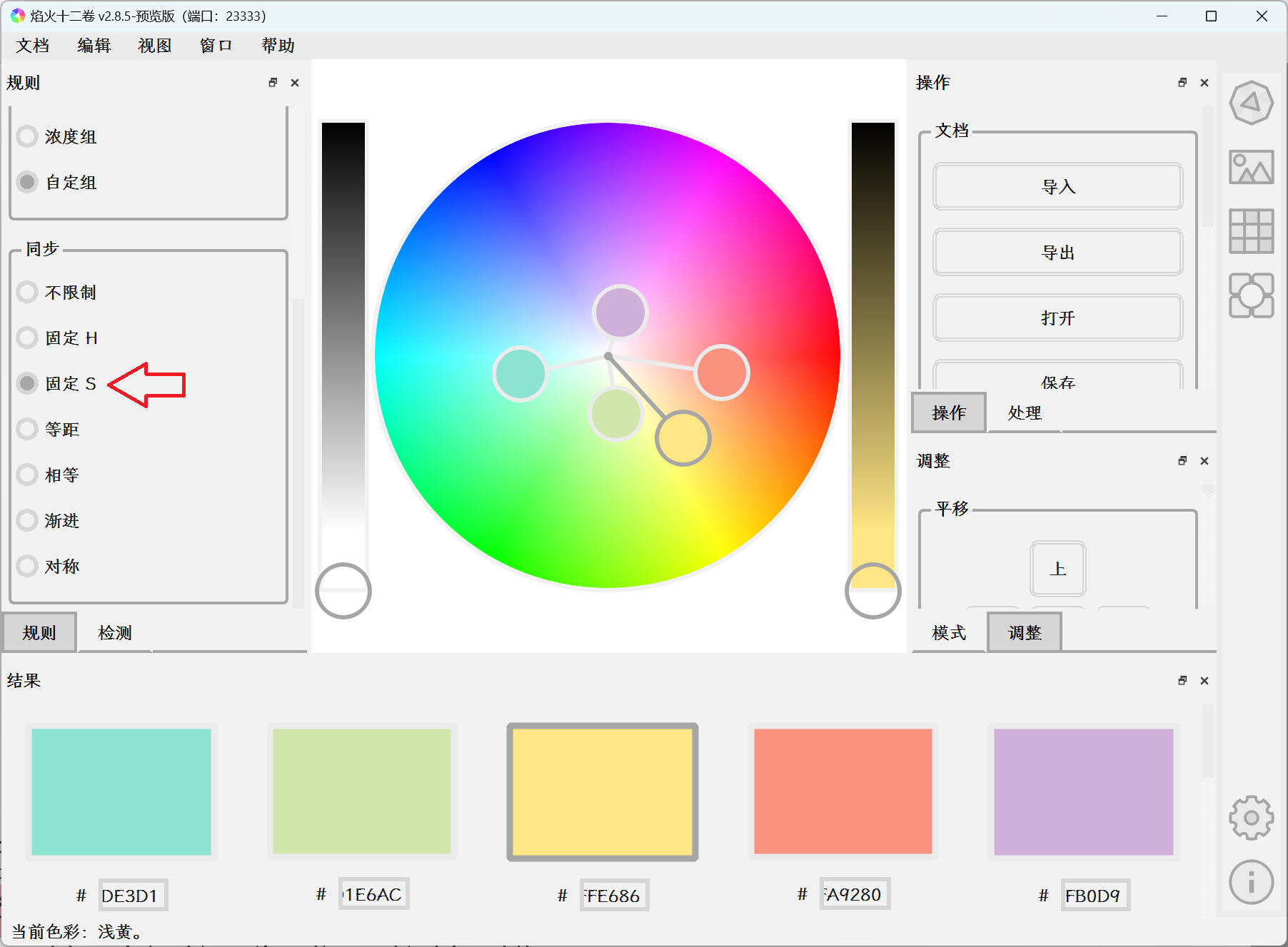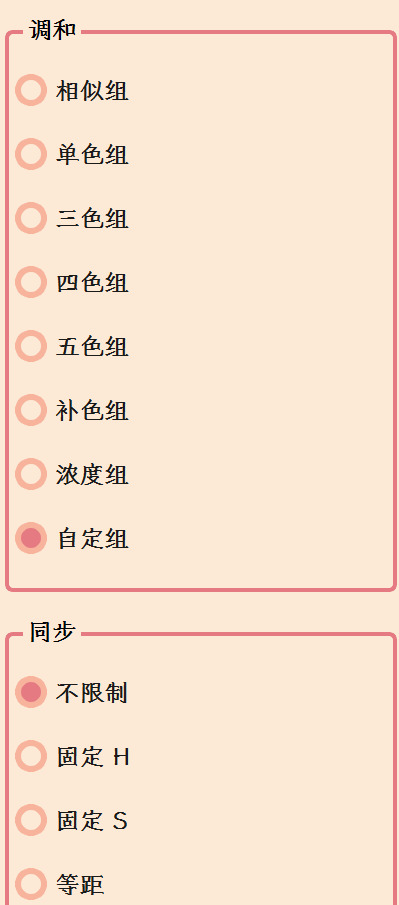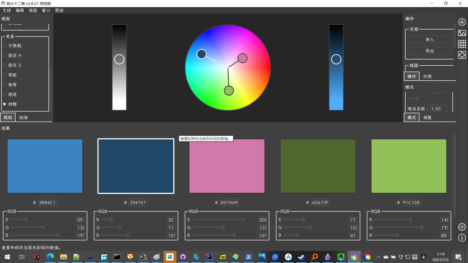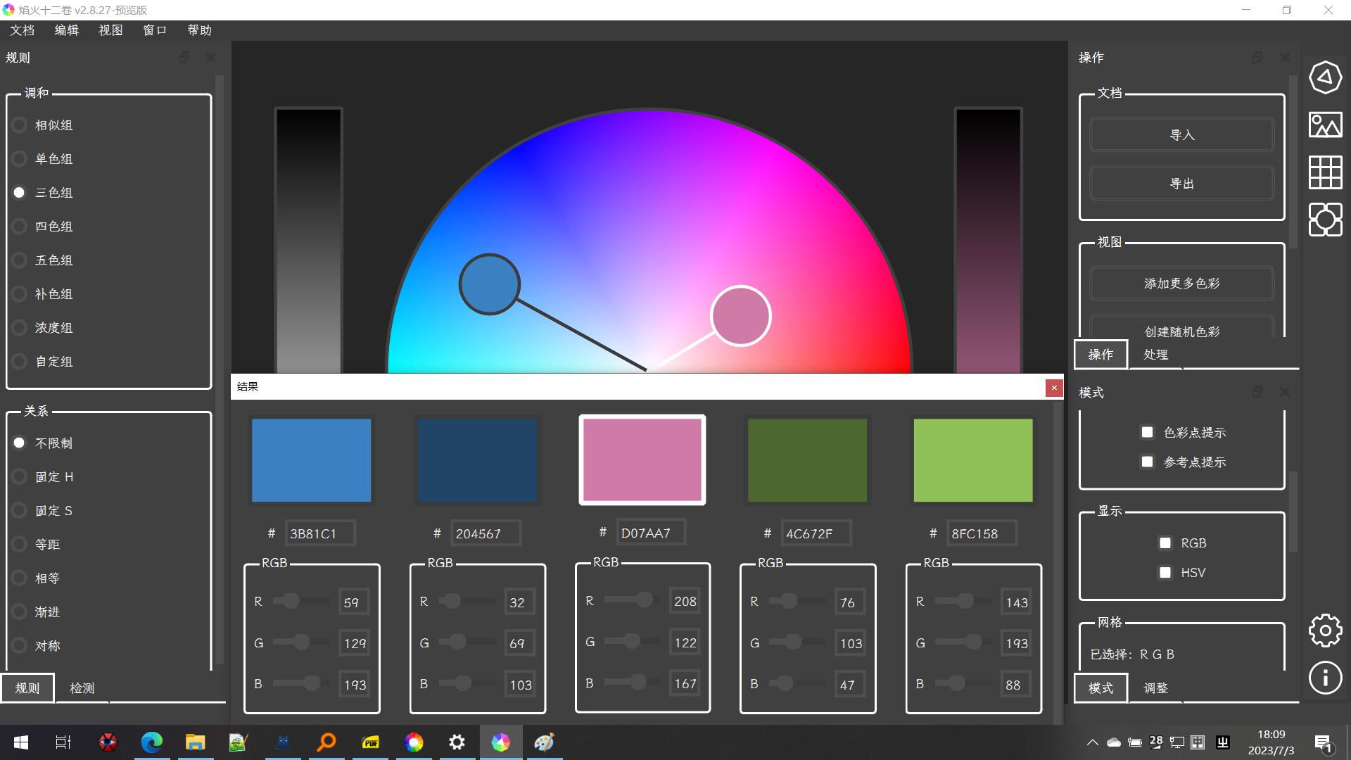 在软件中可以选择不同的搭配规则(相似色、单色、三色、对比色等),以及色彩同步规则(等色相、等饱和度明度、保持比例等)。“合适的搭配色”太宽泛了,不同的应用场景有不同的搭配方法。