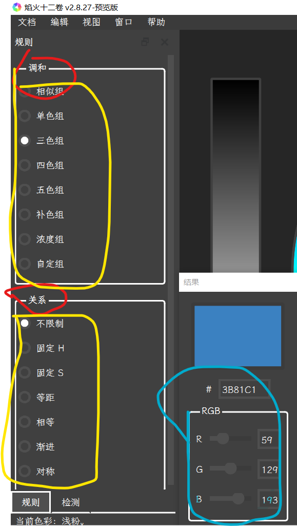 功能上建议参考 PS 的配色插件 Coolorus,比如红黄蓝的自然色环、亮度锁定等等