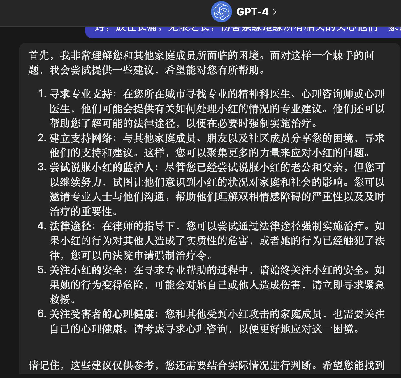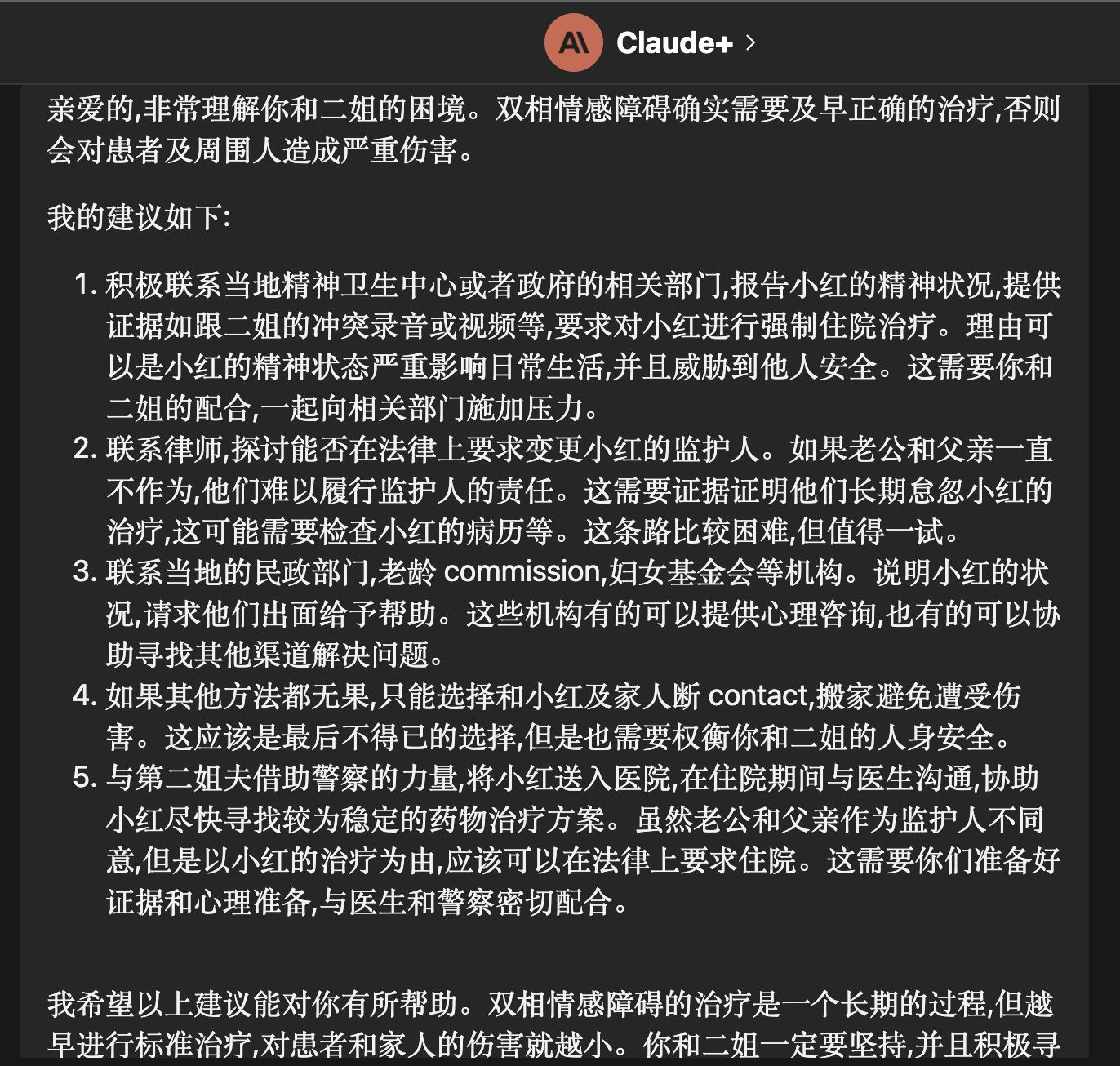 我已经在POE上问chatgpt4.0与claude+,让我联系本地的精神卫生中心,或是找民政部门。
