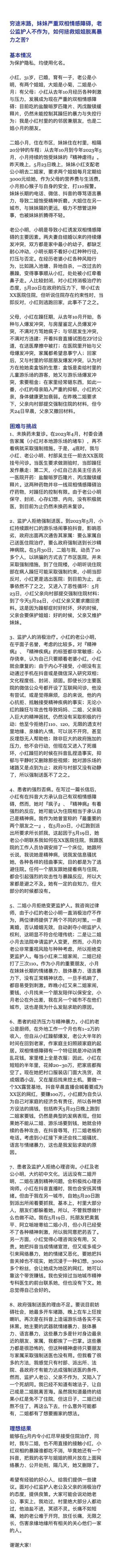 2、监护人拒绝强制送医。到2023年5月,小红持续跟村口的游乐场闹事拍抖音,影响恶劣,政府出面再次通告其家属:要么家属自己送医住院治疗,要么政府强制送到长沙精神病院。在5月30日,二姐与我,动员了10多个人,以哄骗的方式去了市区医院,并未采取强制措施,到了住院楼,小明听说住院部在病人躁狂可能采取强制约束,小明当即反对,小红更是逃出医院;到目前为止,此事依然不了之之,又进入了恶性循环:5月23日,小红父亲向村部提交强制住院材料;到了今天5月24日,小红父亲又要求撤回资料。这是因为躁郁症时好时坏,坏的时候,父亲会要保护姐姐;好的时候,父亲又维护妹妹。
