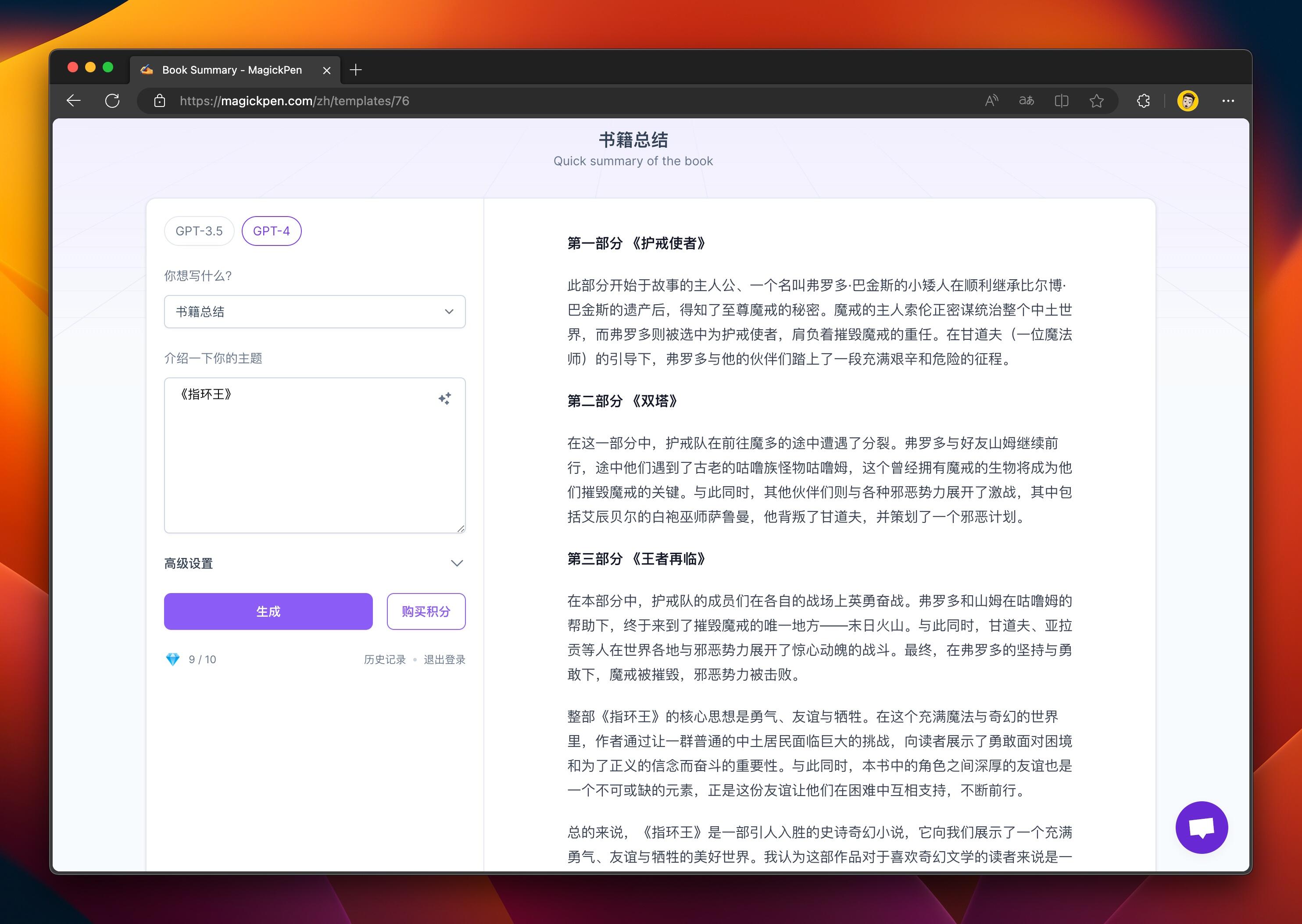 最近在用 ChatGPT 辅助总结看过的书,效果还不错,我集成在 MagickPen 「书籍总结」中了,大家可以试一下![]()